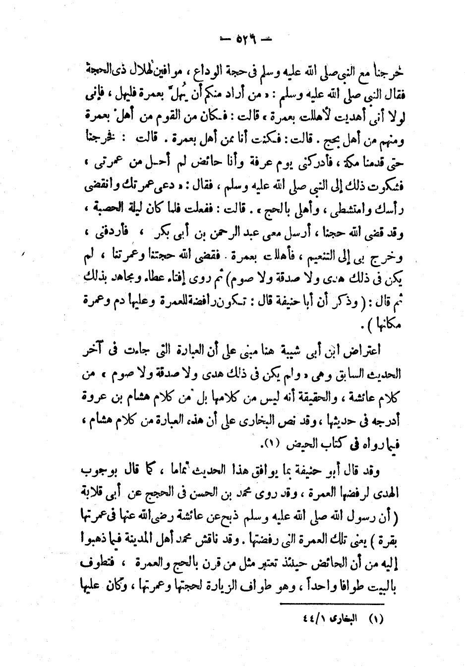«خَرَجْنَا مَعَ النَّبِيِّ - صَلَّى الله عَلَيْهِ وَسَلَّمَ - فِي حَجَّةِ الْوَدَاعِ مُوَافِينَ لِهِلاَلِ ذِي الْحِجَّةِ، فَقَالَ النَّبِيُّ - صَلَّى الله عَلَيْهِ وَسَلَّمَ -: " مَنْ أَرَادَ مِنْكُمْ أَنْ يُهِلَّ بِعُمْرَةٍ فَلْيُهِلَّ، فَإِنِّي لَوْلَا أَنِّي أَهْدَيْتُ لَأَهْلَلْتُ بِعُمْرَةٍ "، قَالَتْ: " فَكَانَ مِنَ الْقَوْمِ مَنْ أَهَلَّ بِعُمْرَةٍ، وَمِنْهُمْ مَنْ أَهَلَّ بِحَجٍّ "، قَالَتْ: " فَكُنْت أَنَا مِمَّنْ أَهَلَّ بِعُمْرَةٍ "، قَالَتْ: " فَخَرَجْنَا حَتَّى قَدِمْنَا مَكَّةَ، فَأَدْرَكَنِي يَوْمُ عَرَفَةَ وَأَنَا حَائِضٌ، لَمْ أَحِلَّ مِنْ عُمْرَتِي، فَشَكَوْتُ ذَلِكَ إِلَى النَّبِيِّ - صَلَّى الله عَلَيْهِ وَسَلَّمَ -، فَقَالَ: " دَعِي عُمْرَتَكَ، وَانْقُضِي رَأْسَك، وَامْتَشِطِي، وَأَهِلِّي بِالْحَجِّ "، قَالَتْ: " فَفَعَلْتُ، فَلَمَّا كَانَتْ لَيْلَةُ الْحَصْبَةِ وَقَدْ قَضَى اللَّهُ حَجَّنَا، أَرْسَلَ مَعِي عَبْدَ الرَّحْمَن بْنَ أَبِي بَكْرٍ، فَأَرْدَفَنِي وَخَرَجَ بِي إِلَى التَّنْعِيمِ، فَأَهْلَلْتُ بِعُمْرَةٍ، فَقَضَى اللَّهُ حَجَّنَا وَعُمْرَتَنَا، لَمْ يَكُنْ فِي ذَلِكَ هَدْيٌ، وَلاَ صَدَقَةٌ، وَلاَ صَوْمٌ "». ثم روى إفتاء عطاء ومجاهد بذلك ثم قال: