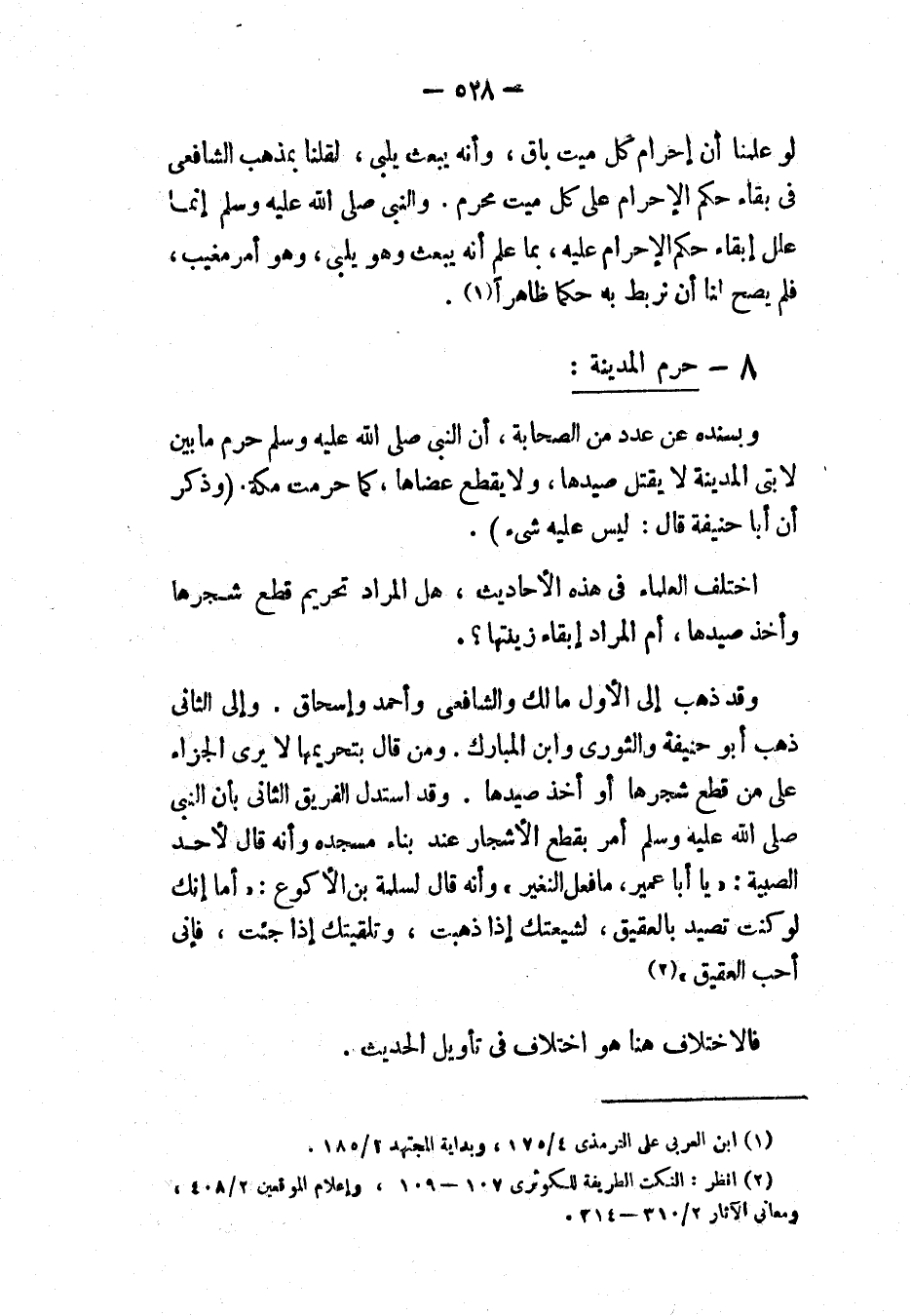 اختلف العلماء في هذه الأحاديث، هل المراد تحريم قطع شجرها وأخذ صيدها، أم المراد إبقاء زينتها؟.