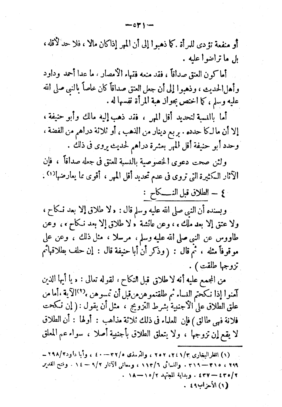 (¬1) انظر " البخاري ": 3/ 251، 252؛ و" الترمذي ": 5/ 32، 40؛ و" أبا داود ": 3/ 298، 299؛ و" النسائي ": 6/ 113؛ و" معاني الآثار ": 2/ 9، 14؛ و" فتح القدير ": 2/ 435، 437؛ و" بداية المجتهد ": 2/ 15، 18.