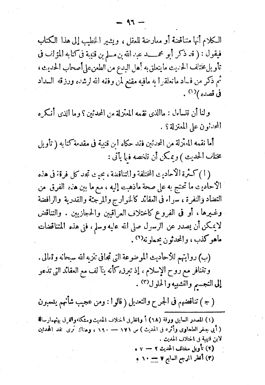 الكلام أنها متناقضة أو معارضة للعقل، ويشير الخطيب إلى هذا الكتاب فيقول: «قَدْ ذَكَرَ أَبُو مُحَمَّدٍ عَبْدُ اللَّهِ بْنُ مُسْلِمِ بْنِ قُتَيْبَةَ فِي كِتَابِهِ الْمُؤَلَّفِ فِي تَأْوِيلِ مُخْتَلِفِ الْحَدِيثِ مَا يَتَعَلَّقُ بِهِ أَهْلُ الْبِدَعِ مِنَ الطَّعْنِ عَلَى أَصْحَابِ الحَدِيثِ، ثُمَّ ذَكَرَ مِنْ فَسَادِ مَا تَعَلَّقُوا بِهِ، مَا فِيهِ مُقْنِعٌ لِمَنْ وَفَّقَهُ اللَّهُ لِرُشْدِهِ، وَرَزَقَهُ السَّدَادَ فِي قَصْدِهِ» (¬1)