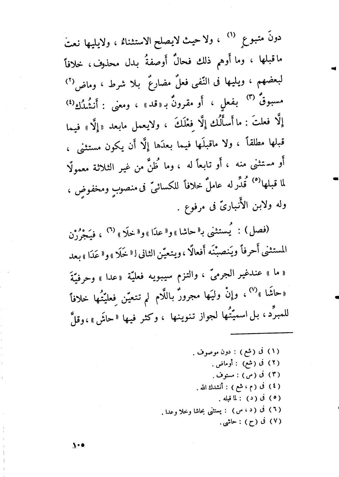 دون متبوع، ولا حيث لا يصلُحُ الاستثناء. ولا يليها نعتٌ ما قبلها، وما اوهم ذلك فحال، او صفة بدل محذوف، خلافا لبعضهم ويليها في النفي فعل مضارع بلا شرط، وما مسبوق بفعل، او مقرون بـ “ قد “، ومعنى “ انشدك الا فعلت “ اي: ما اسألك الا فعلك.