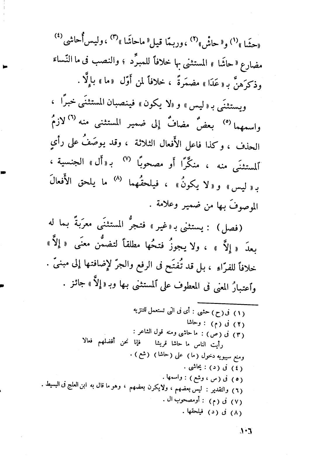 “ حشا، وحاش “، وربما قيل: ما حاشا، وليس “ احاشي “ مضارع حاشا المستثنى بها، خلافا للمبرد، والنصب في: “ ما النساء وذكرهن “ بـ “ عدا “ مضمرة، خلافا لمن اول “ ما “ بـ “ الا “.