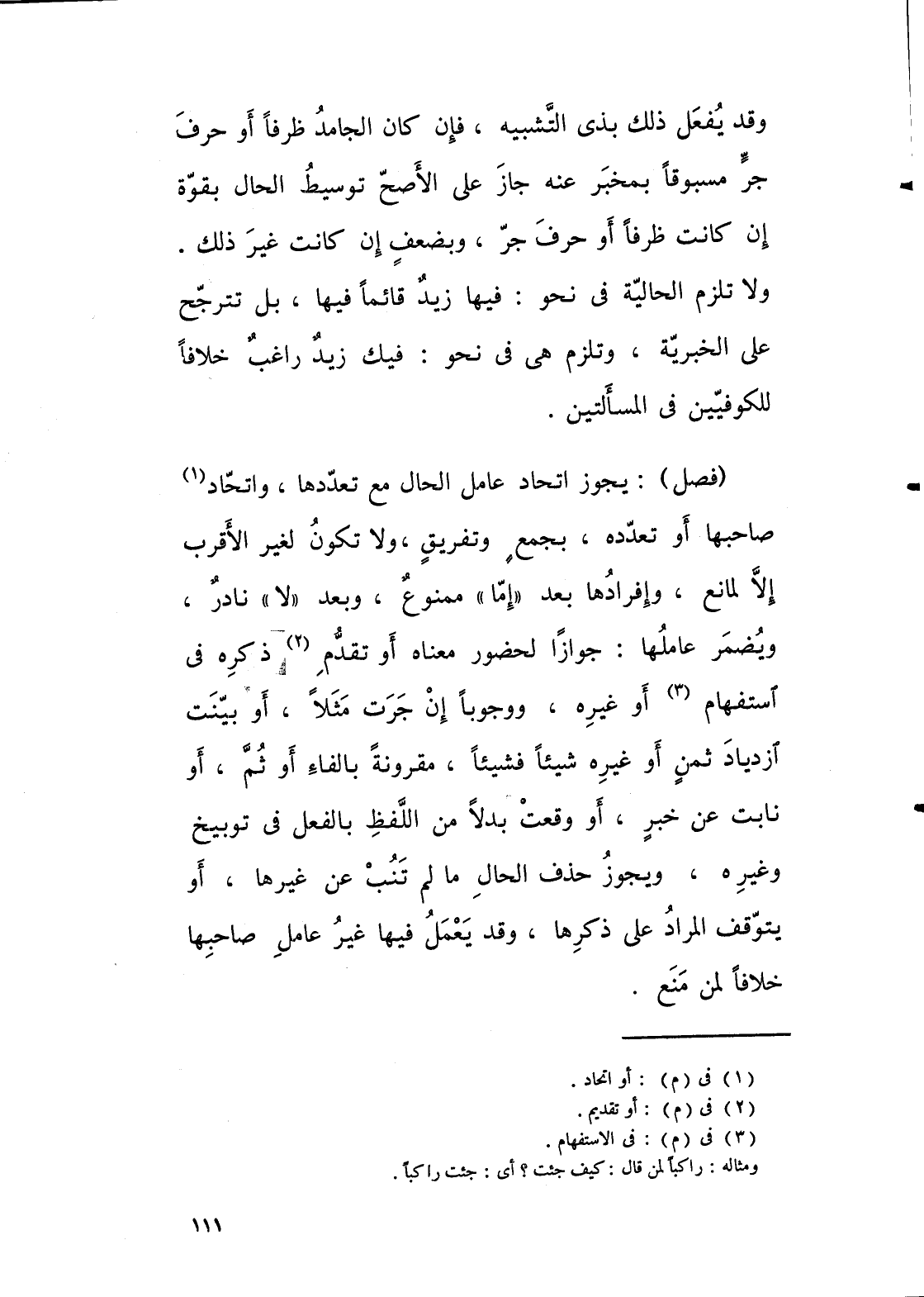 يجوز اتحاد عامل الحال مع تعددها واتحاد صاحبها او تعدده بجمع او تفريق، ولا تكون لغير الاقرب الا لمانع وافرادها بعد “ اما “ ممنوع، وبعد “لا” نادر. ويضمر عاملها جوازا لحضور معناه او تقدم ذكره في استفهام او غيره، ووجوبا ان جرت مثلا، او بينت ازديادا ثمن او غيره شيئا فشيئا، مقرونة بـ “الفاء “ او “ ثم “، او نابت عن خبر، او وقعت بدلا من الفظ بالفعل في توبيخ وغيره.