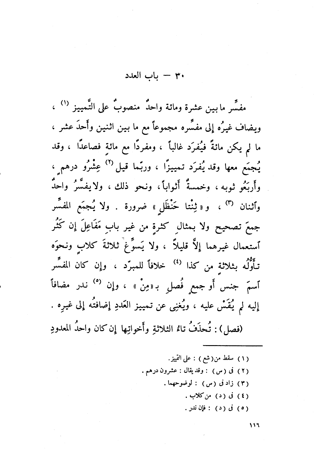 مفسر ما بين عشرة ومائة واحد منصوب على التمييز ويضاف غيره الى مفسره مجموعا مع ما بين اثنين واحد عشر، ما لم يكن مائة فيفرد غالبا، ومفردا مع مائة فصاعدا، وقد يجمع معها وقد يفرد تمييزا وربما قيل: عشرو درهم، واربعو ثوبه، وخمسة اثوابا، ونحو ذلك، ولا يفسر واحد واثنان، و " ثنتا حنظل " ضرورة. ولا يجمع المفسر جمع تصحيح، ولا بمال كثرة، من غير باب مفاعل ان كثر استعمال غيرهما، الا قليلا، ولا يسوغ: ثلاثة كلاب نحوه، تأوله بثلاث من كذا، خلافا للمبرد، وان كان المفسر اسم جنس، او جمع