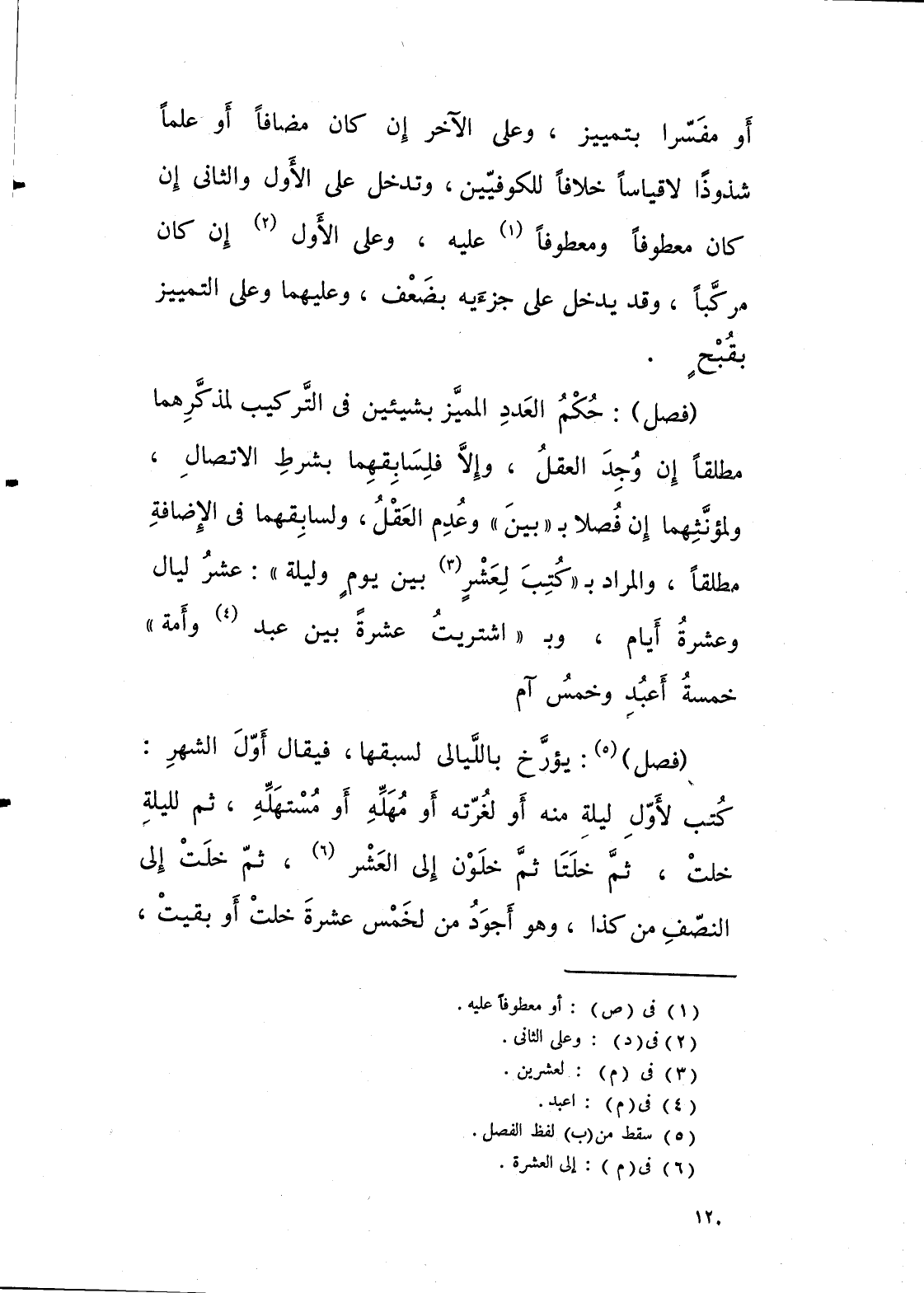 حكم العدد المميز بشيئين في التركيب لمذكرهما مطلقا ان وجد العقل، والا فلسابقهما بشرط الاتصال، ولمؤنثهما ان فصلا بـ “ بين “ وعدم العقل ولسابقهما في الاضافة مطلقا، والمراد بـ: كتب لعشر بين يوم وليلة: عشر ليال، وعشر ايام، وبـ: اشتريت عشر بين عبد وامة: خمسة اعبد وخمس ام.