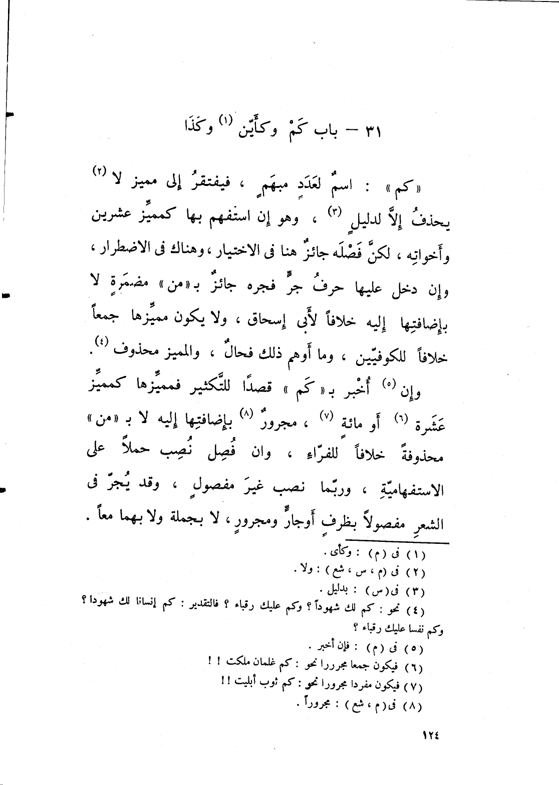 " كم " اسم لعدد مبهم، فيفتقر الى مميز لا يحذف الا لدليل، وهو ان استفهم بها كمميز عشرين واخواته، اكن فصله جائز هنا في الاختيار وهناك في الاضطرار، وان دخل عليها حرف جر، فجره جائز بـ " من " مضمرة، لا بإضافتها اليه خلافا لأبي اسحاق، ولا يكون مميزها جمعا خلافا للكوفيين، وما اوهم ذلك فحال، والمميز محذوف.