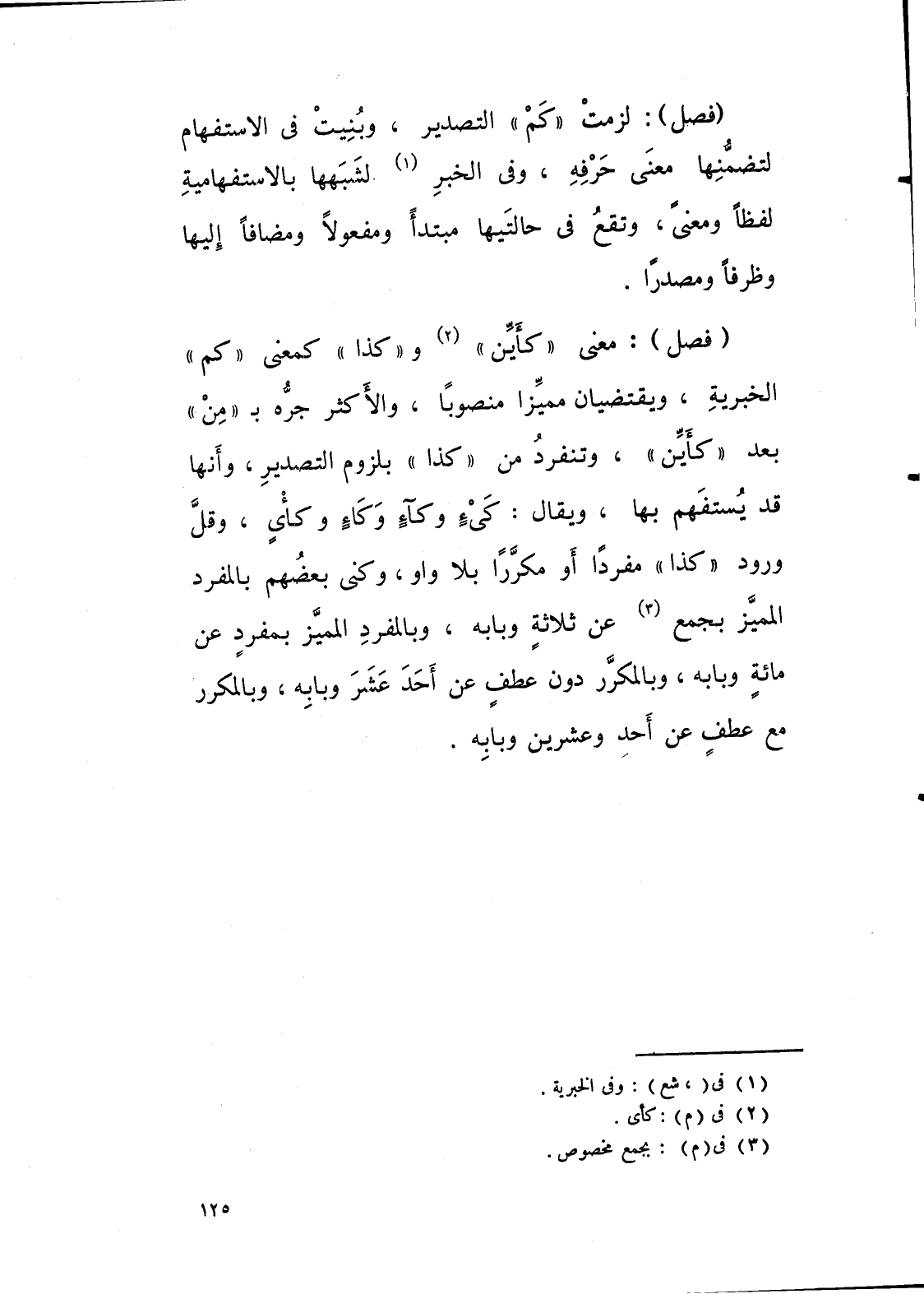 معنى “ كأين “ و” كذا “ كمعنى “ كم “ الخبرية، ويقتضيان مميزا منصوباً، والاكثر جره بـ “ من “ بعد “ كأين “ وتنفرد من (كذا) بلزوم التصدير، وانها قد يستفهم بها، ويقال: كيء، وكاء، وكأي، وقل ورود (كذا) مفردا، او مكررا بلا واو، وكنى بعضهم بالمفرد المميز يجمع عن ثلاثة وبابه، وبالمفرد المميز بمفرد، عن مائة وبابه وبالمكرر دون عطف عن احد عشر وبابه، وبالمكرر مع عطف عن احد وعشرين وبابه.