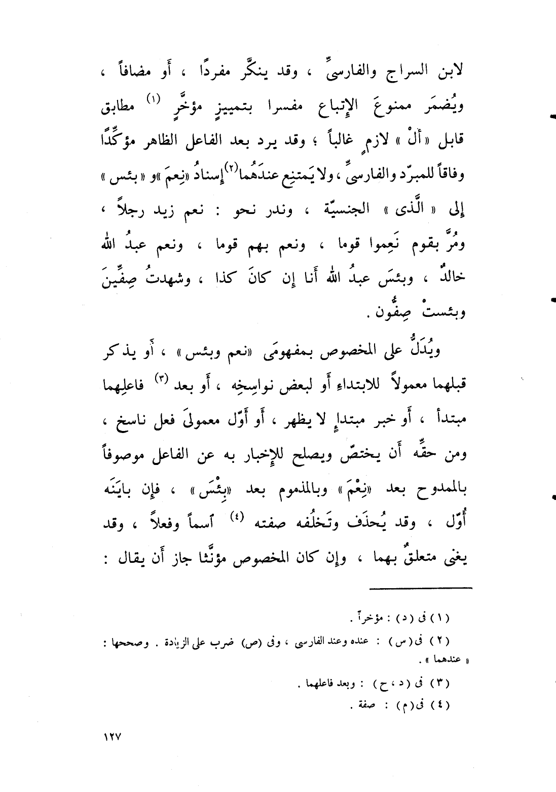 لأبن سراج والفارسي، وقد ينكر مفردا او مضافا، ويضمر ممنوع الاتباع مفسرا بتمييز مؤخر، مطابق قابل “ال “ لازم غالبا، وقد يرد بعد الفعل الظاهر مؤكدا وفاقا للمبرد، والفارسي، ولا يمتنع عندهما اسناد “ نعم “ و “ بئس “ الى الذي جنسية، وندر نحو: نعم زيد رجلا ومر بقوم نعموا قوما، ونعم بهم قوما، ونعم عبد الله خالد، وبئس عبد الله انا ان كان كذا وشهدت صفين، وبئست صفون. ويدل على المخصوص، بمفهومي “ نعم “ و “ بئس “، او يذكر قبلهما، معمولا للابتداء، او لبعض نواسخه، او باعد فاعلهما، مبتدأ او خبر مبتدأ، لا يظهر او اول معمولي فعل ناسخ، ومن حقه ان يختص ويصلح للاخبار به عن الفاعل، موصوفا للممدوح بعد “ نعم “، وبالمذموم بعد “ بئس “ فإن باينه اول، وقد يحذف، وتخلفه صفته اسما وفعلا وقد يغني متعلق بهما، وان كان المخصوص مؤنثا جاز ان يقال: