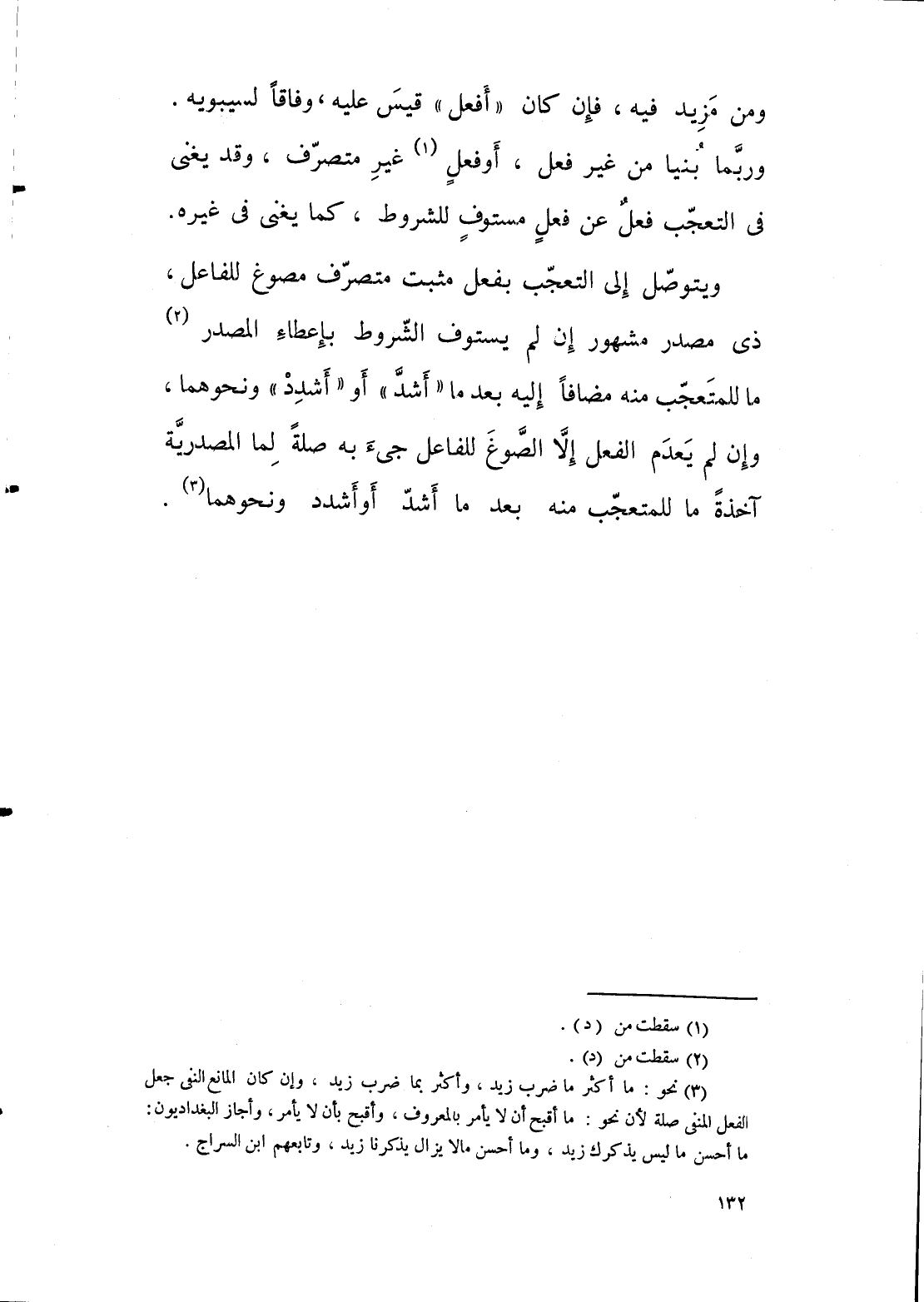 ومن مزيد فيه، فإن كان “ افعل “ قيس عليه، وفاقا لسيبويه، وربما بنيا من غير فعل، او فعل غير متصرف وقد يغني في التعجب فعل عن فعل مستوف للشروط كما يغني في غيره، ويتوصل الى التعجب بفعل مثبت متصرف، مصوغ للفاعل، ذي مصدر مشهور ان لم يستوف الشروط بإعطاء المصدر ما للمتعجب منه مضافا اليه، بعد ما اشد او اشدد ونحوهما، وان لم يعدم الفعل الا الصوغ للفاعل جيء به صلة لما الصدرية اخذه ما للمتعجب منه بعد “ ما اشد “ او “ اشدد “ ونحوهما.
