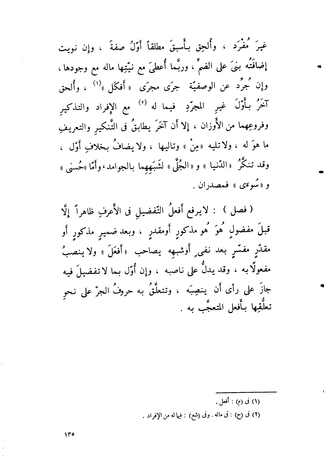 لا يرفع افعل التفضيل في الاعرف ظاهرا الا قبل مفضول هو مذكور او مقدر، وبعد ضمير مذكور او مقدر مفسر بعد نفي اوشبهه يصاحب “ افعل “ ولا ينصب مفعولا به، وقد يدل على ناصبه، وان اول بما لا تفضيل فيه جاز على رأي ان ينصبه، وتتعلق به حروف الجر على نحو تعلقها بـ “ افعل “ المتعجب به.