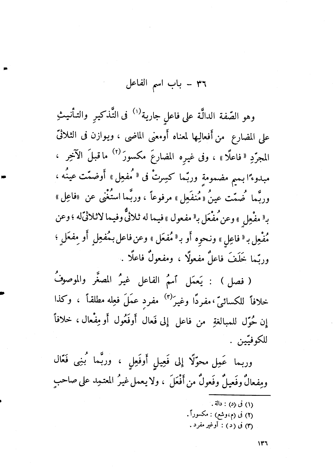 يعمل اسم الفاعل غير المصغر والموصوف خلافا للكسائي، مفردا وغير مفرد، عمل فعله مطلقا، وكذا ان حول للمبالغة من " فاعل " الى " فعال " او " فعول " او " مفعال " خلافا للكوفيين، وربما عمل محولا الى " فعيل " او " فعل " وربما بني " " فعال " و " مفعال " و " فعيل " و " فعول " من " افعل "، ولا يعمل غير المتعمد على صاحب