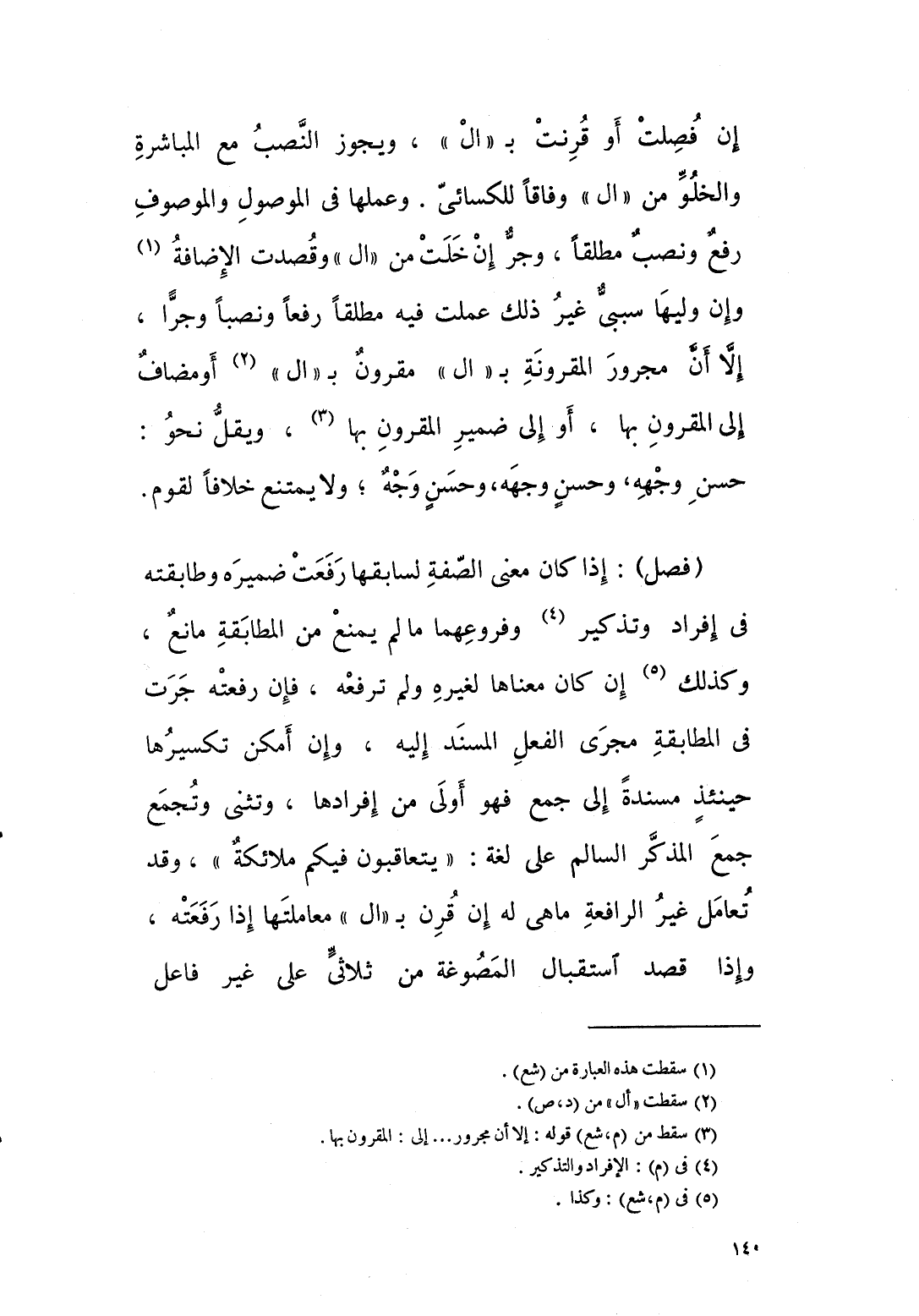 اذا كان معنى الصفة لسياقها رفع ضميره ان كان معناها بغيره ولن ترفعها فإن رفعته جرت ف المطابقة مجرى الفعل المسند اليه، وان امكن تكسيرها حينئذ مسندة الى جمع فهو اولى من افرادها، وتثنى وتجمع جمع المذكر السالم على لغة “ يتعاقبون فيكم ملائكة “ وقد تعامل غير الرافعة ما هي ... ان قرن بـ “ ال” معاملتها اذا رفعت.