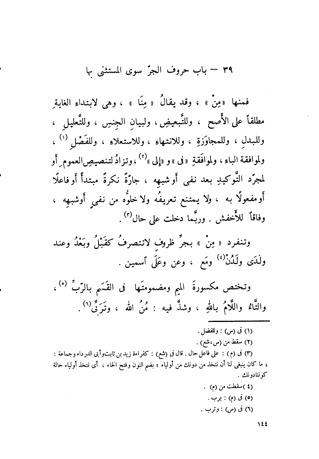 فمنها " من " وقد يقال: منا وهي لابتداء الغاية مطلقا على الاصح وللتبعيض ولبيان الجنس وللتعليل وللبدل وللمجاوزة وللانتهاء وللاستعلاء وللفصل ولموافقة الباء ولموافقة في. وتزاد لتنصيص العموم او لمجرد التوكيد بعد نفي او شبهه جارة نكرة مبتدأ او فاعلا او مفعولا به ولا يمتنع تعريفه ولا خلوه من نفي او شبهه وفاقاً للاخفش وربما دخلت على حال. وتنفرد " من" بجر ظروف لا تتصرف كـ: قبل وبعد وعند ولدى ولدن ومع ومن وعلى اسمين، وتختص مكسورة الميم ومضمومتها في القسم بـ " الرب " والتاء واللام بـ " الله " وشذ فيه: من الله وتربي.