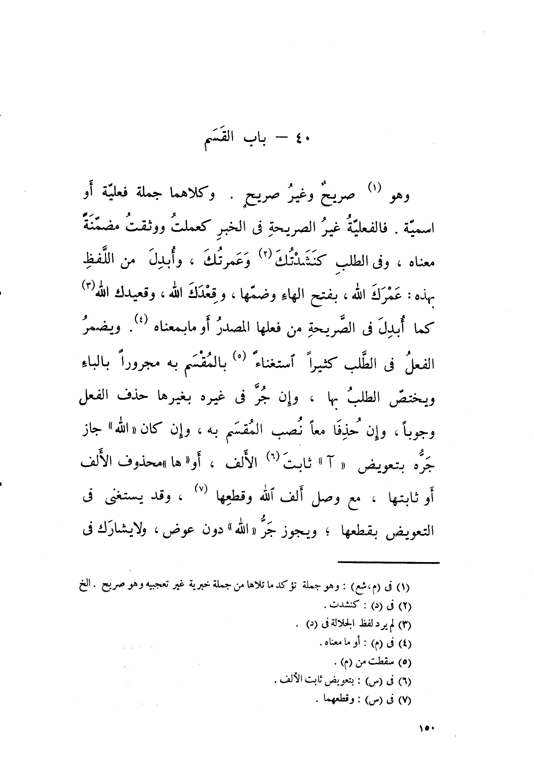 وهو صريح، وغير صريح وكلاهما جملة فعلية او اسمية، فالفعلية غير الصريحة في الخبر كعلمت ووثقت مضمّنة معناه، وفي الطلب كنشدتك، وعمرتك، وابدل من اللفظ بهذه عمرك الله بفتح الهاء وضمها وقعدك الله، وقعيدك الله كما ابدل في الصريحة من فعلها المصدر او ما بمعناه. ويضمر الفعل في الطلب كثير استغناء بالمقسم به مجرورا بالباء. ويختص الطلب بها وان جر في غيره بغيرها حذف الفعل وجوبا وان حذفا معا نصب المقسم به، وان كان " الله " جاز جره بتعويض اثبات الالف او " ها " محذوف الالف او ثابتها مع وصل الف " الله " وقطعها، وقد يستغنى في التعويض بقطعها ويجوز جر " الله " دون عوض ولا يشارك في