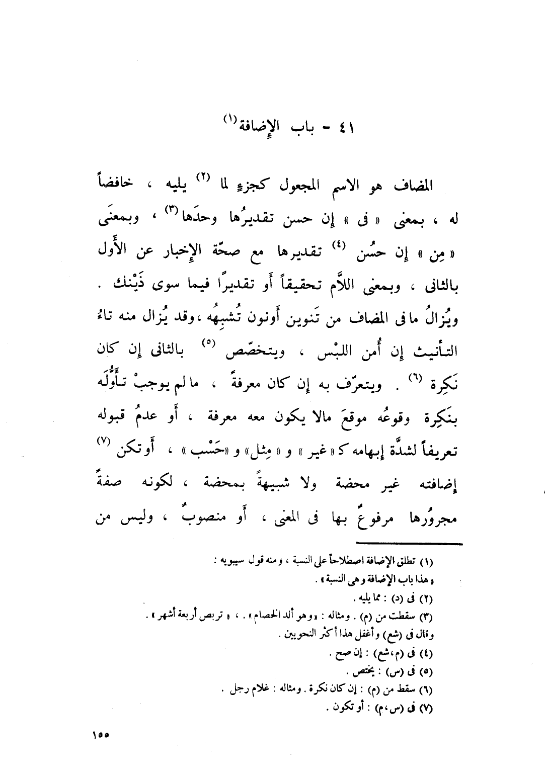 المضاف هو الاسم المجعول كجزء لما يليه خافضا له بمعنى " في" ان حسن تقديرها وحدها، وبمعنى " من " ان حسن تقيرها مع صحة الاخبار عن الاول بالثاني، وبمعنى اللام تحقيقا او تقديرا فيما سوى ذينك، ويزال ما في المضاف من تنوين او نون تشبهه، وقد يزال منه تاء التأنيث ان امن اللبس. ويتخصص بالثاني ان كان نكرة. ويعترف به ان كان معرفة ما لم يوجب تأوله بنكرة وقوعه موقع ما لا يكون معه معرفة او عدم قبوله تعريفا لشدة ابهامه كـ " غير " و " مثل " و " حسب "، او تكن اضافته غير محضة ولا شبيهة بمحضة لكونها صفة مجرورة مرفوع بها في المعنى او منصوب، وليس من