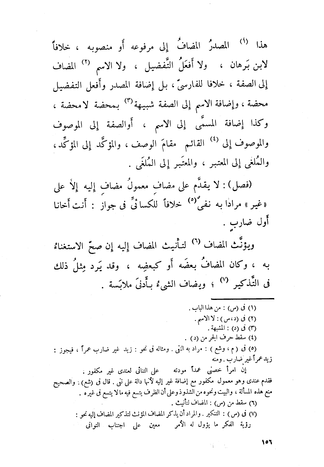 لا يتقدم على مضاف معمول مضاف اليه الا على “ غير “ مرادفا به نفي خلافا للكسائي في جواز: “ انت اخانا اول ضارب “ ويؤنث المضاف لتأنيث المضاف اليه ان صح الاستغناء به وكان المضاف بعضه او كبعضه، وقد يرد مثل ذلك في التذكير ويضاف الشيء بأدنى ملابسة.