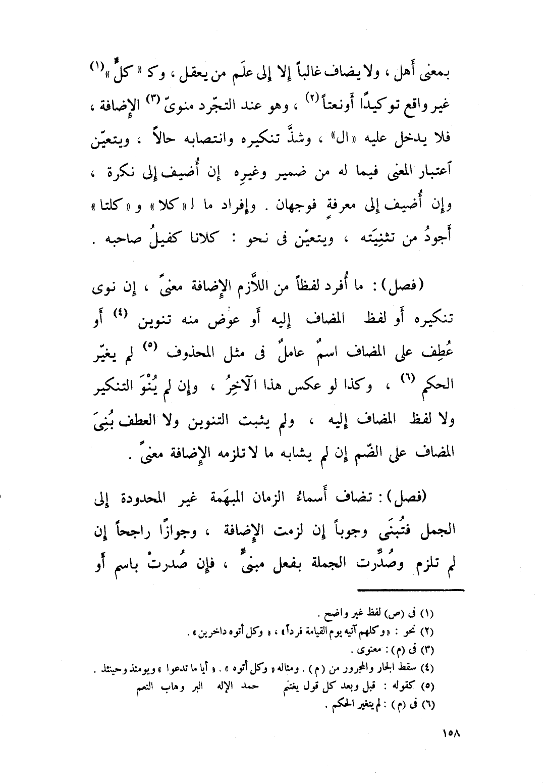 بمعنى اهل ولا يضاف غالبا الى علم من يعقل وكـ “ كل “ غير واقع توكيدا او نعتا، وهو عند التجرد منوي الاضافة فلا يدخل عليه “ ال “ وشذ تنكيره وانتصابه حالا، ويتعين اعتبار المعنى فيما له من ضمير وغيره ان اضيف الى نكرة، وان اضيف الى معرفة فوجهان. وافراد ما لـ “ كلا “ و “ كلتا “ اجود من تثنيته، ويتعين في نحو: كلانا كفيل صاحبه. ما افرد لفظا من اللازم الاضافة معنى، ان نوي تنكيره او لفظ المضاف اليه او عوض منه تنوين او عطف على المضاف اسم عامل في مثل المحذوف لم يغير الحكم، وكذا لو عكس هذا الاخر، وان لم ينو التنكير ولا لفظ المضاف اليه، ولم يثبت التنوين ولا العطف بني على الضم ان لم يشابه ما لا تلزمه الاضافة معنى.