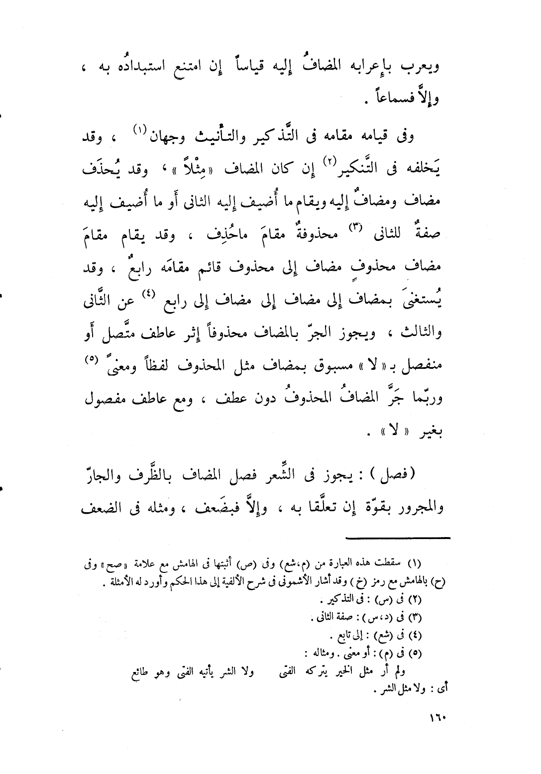 ويعرب بإعرابه المضاف اليه قياسا ان امتنع استبداده به والا فسماعا. وفي قيامه مقامه في التذكير والتأنيث جهان. وقد يخلفه في التنكير ان كان المضاف مثلا، وقد يحذف مضاف ومضاف اليه، ويقام ما اضيف اليه الثاني او ما اضيف اليه صفة محذوفة مقام ما حذف، وقد يقام مقام مضاف محذوف مضاف الى محذوف قائم مقامه رابع. وقد يستغنى بمضاف الى مضاف الى مضاف الى رابع عن الثاني والثالث، ويجوز الجر بالمضاف محذوفا اثر عاطف متصل او منفصل بـ “ لا “ مسبوق بمضاف مثل المحذوف لفظا ومعنى. وربما جر المضاف المحذوف دون عطف، ومع عاطف مفصول بغير “ لا.