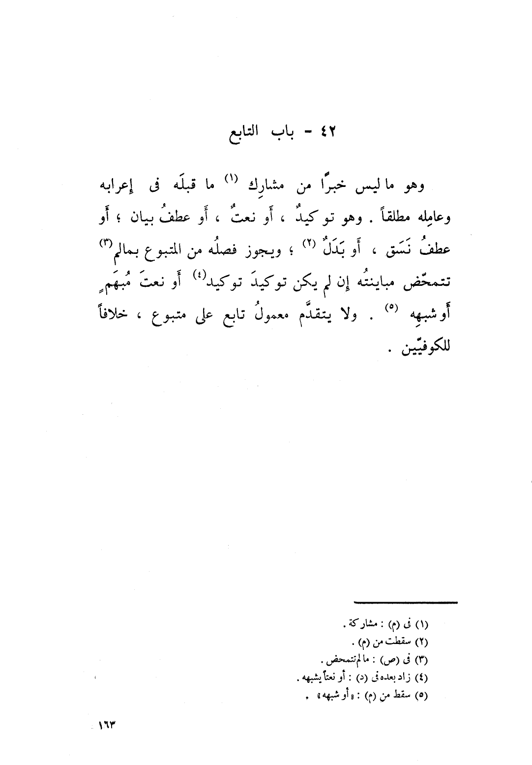 وهو ما ليس خبراً من مشارك ما قبله في اعرابه وعامله مطلقاً. وهو توكيد، او نعت، او عطف بيان، او عطف نسق، او بدل. ويجوز فصله من المتبوع بما لم تتمحض مباينته إن لم يكن توكيدَ توكيدٍ، او نعت مبهم أو شبهه، ولا يتقدم معمول تابع على متبوع خلافا للكوفيين.