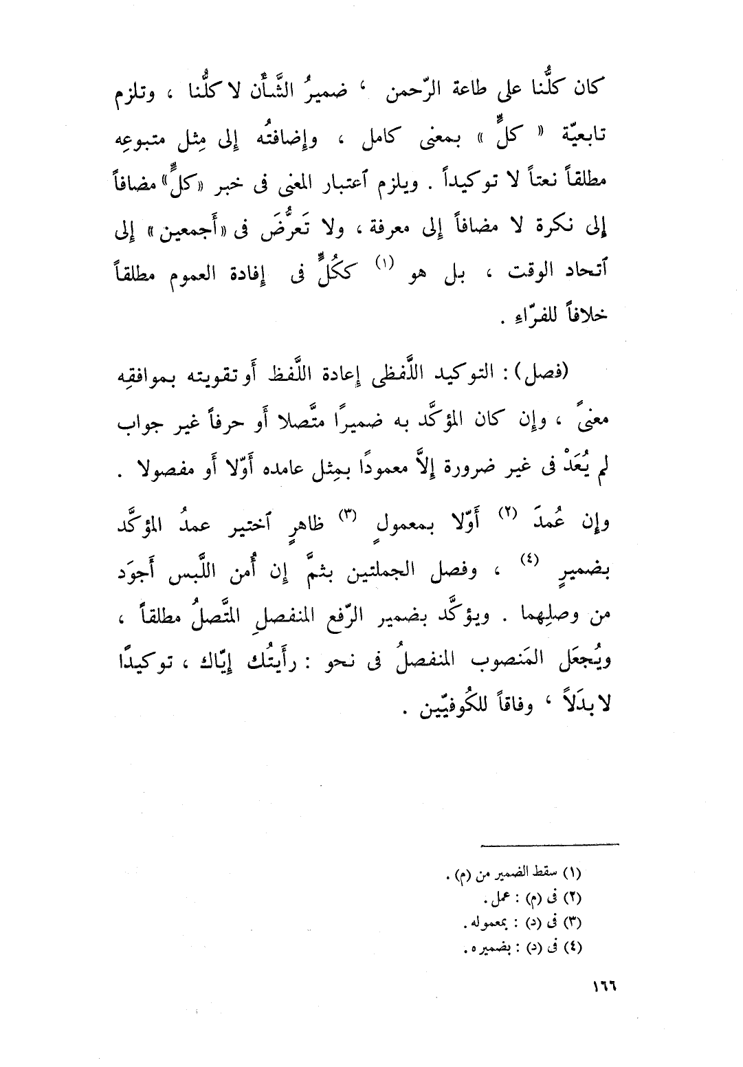 كان كلُّنا على طاعة الرحمن، ضمير الشأن، لا كلنا، ويلزم تابعية “ كل“ بمعنى كامل واضافته الى مثل متبوعه مطلقا نعتاً لا توكيداً. ويلزم اعتبارُ المعنى في خبر “ كل “ مضافاً الى نكرة لا مضافاً الى معرفة، ولا تعرُّض في “ اجمعين “ الى اتحاد الوقت بل هو ككل في افادة العموم مطلقا خلافا للفراء.