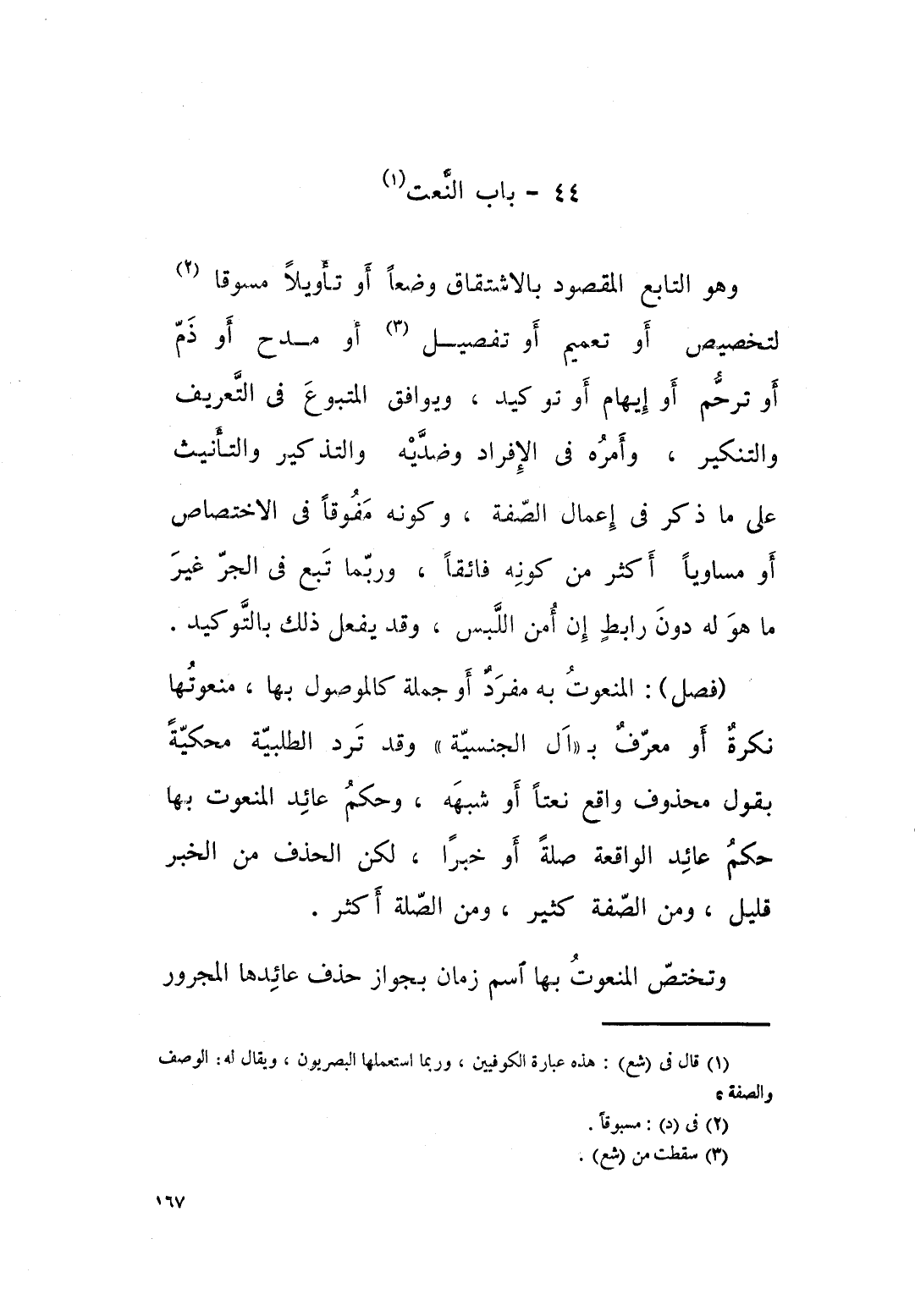 وهو التابع المقصود بالاشتقاق وضعاً، او تأويلاً مسوقاً لتخصيص، او تعميم، او تفصيل، او مدح، او ذم، او ترحم، او ايهام، او توكيد. ويوافق المتبوع في التعريف والتنكير، وامره في الافراد وضديه والتذكير والتأنيث على ما ذكر في اعمال الصفة، وكونه مفوقاً في الاختصاص او مساوياً أكثر من كونه فائقا، وربما تبع في الجر غير ما هو له دون رابط ان أُمن اللبس وقد يفعل ذلك بالتوكيد.