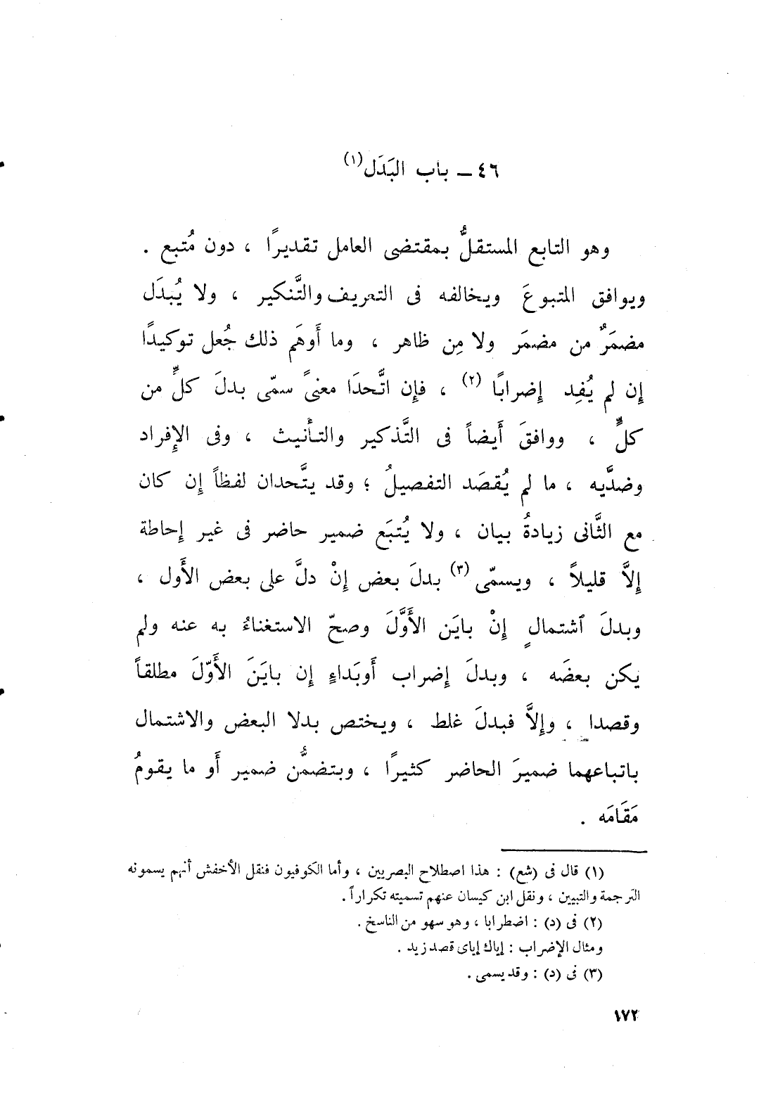 وهو التابع المستقل بمقتضى العامل تقديراً دون متبع ويوافق المتبوع ويخالفه في التعريف والتنكير ولا يبدل مضمر من مضمر ولا من ظاهر. وما اوهم ذلك جعل تكيدا ان لم يفد اضرابا. فإن اتحدا معنى سمي بدل كل، من كل، ووافق أيضا في التذكير والتأنيث، وفي الافراد وضديه، ما لم يقصد التفصيل، وقد يتحدان لفظا ان كان مع الثاني زيادة بيان، ولا يتبع ضمير حاضر في غير احاطة الا قليلا. ويسمى بدل بعض ان دل على بعض الاول، وبدل اشتمال ان باين الاول وصح الاستغناء به عنه ولم يكن بعضه، وبدل اضراب او بداء ان باين الاول مطلقا وقصدا والا فبذل غلط. ويختص بدلا البعض والاشتمال بإتباعهما ضمير الحاضر كثيرا وبتضمن ضمير او ما يقوم مقامه.