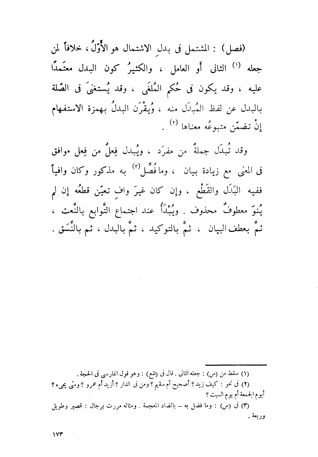 المشتمل في بدل الاشتمال هو الاول، خلافا لمن جعله الثاني او العامل، وقد يستغنى بالبدل عن لفظ المبدول منه، ويقرن البدل بهمزة الاستفهام ان تضمن متبوعا معناها. وقد تبدل جملة من مفرد، ويبدل فعل من فعل موافق في المعنى مع زيادة بيان، وما فصل به مذكور وكان وافيا ففيه البدل والقطع، وان كان غير واف تعين قطعه ان لم ينو معطوف محذوف. ويبدأ عند اجتماع التوابع بالنعت، ثم بعطف البيان، ثم بالتوكيد، ثم بالبدل، ثم بالنسق.