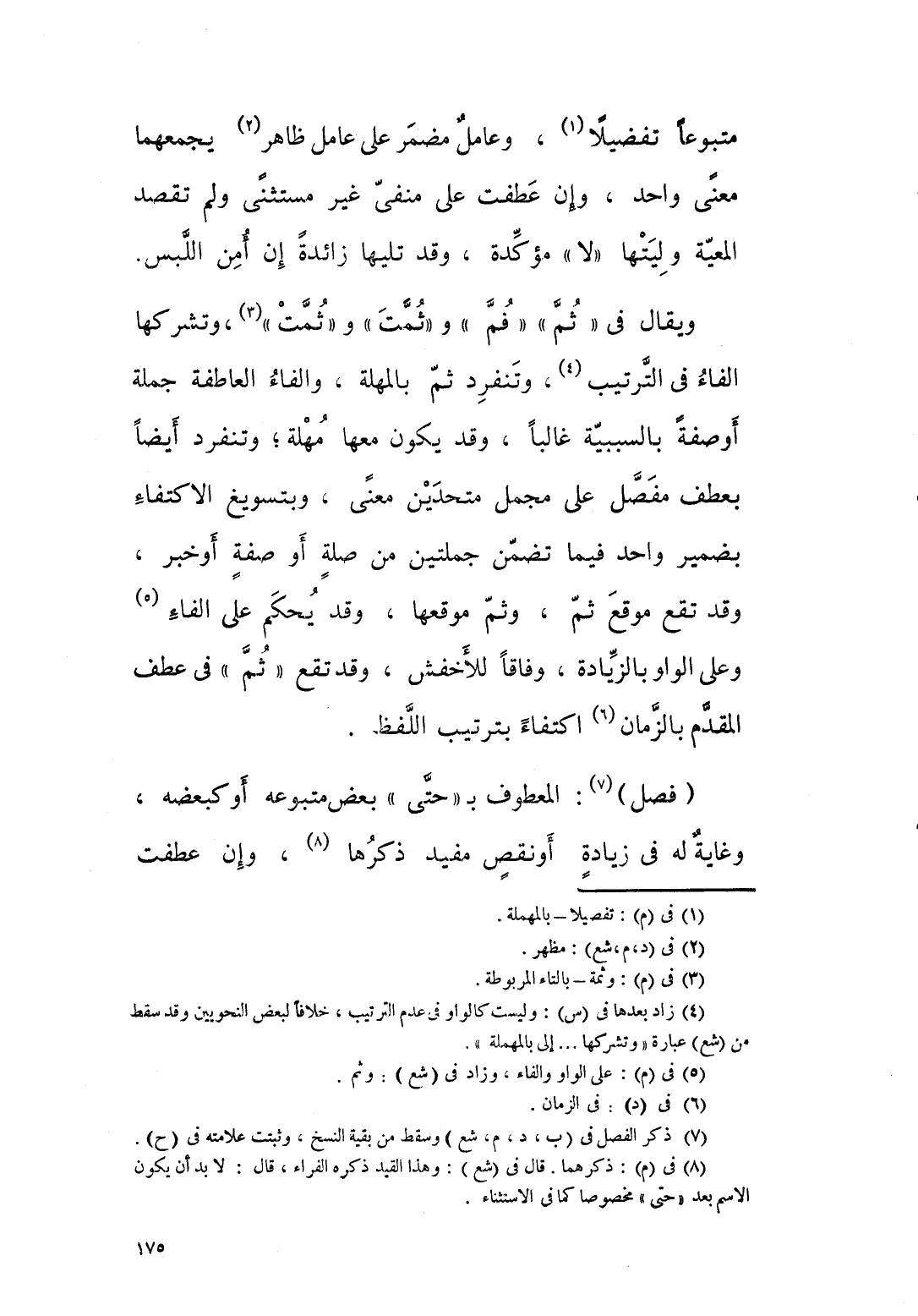 متبوعها تفصيلا، وعامل مضمر على عامل ظاهر يجمعهما معنى واحد، وان عطفت على منفي غير مستثنى ولم تقصد المعية وليتها “ لا “ مؤكدة وقد تليها زائدة ان امن اللبس. ويقال في ثم فم وثمت “ وثمت “، وتشركها الفاء في الترتيب. وتنفرد ثم بالمهلة، والفاء العاطفة جملة او صفة بالسببية غالبا، وقد يكون معها مهلة وتنفرد ايضا بعطف مفصل مجمل على متحدين معنى وبتسويغ الاكتفاء بضمير واحد فيما تضمن جملتين من صلة او صفة او خبر، وقد تقع موقع ثم، وثم موقعها، وقد يحكم على الفاء وعلى الواو بالزيادة وفاقا للاخفش، وقد تقع ثم في عطف المقدم بالزمان اكتفاء بترتيب اللفظ. المعطوف بحتى بعض متبوعه او كبعضه، وغاية له في زيادة او نقص مفيد ذكرها، وان عطفت