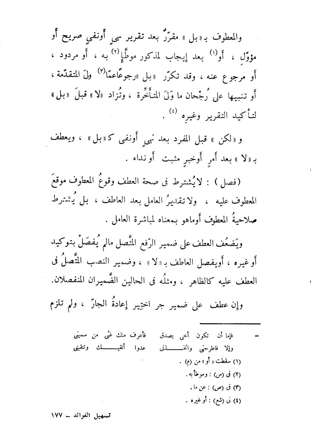 والمعطوف ببل مقرر بعد تقرير نهي او نفي صريح او مؤول او بعد ايجاب لمذكور موطأ به، او مردود او مرجوع عنه وقد تكرر “ بل “ رجوعا عن ما ولي المتقدمة او تنبيها على رجحان ما ولي المتأخرة وتزاد “ لا “ قبل “ بل “ لتأكيد التقرير وغيره “ ولكن “ قبل المفرد بعد نهي او نفي كـ “ بل “ ويعطف بـ “ لا “ بعد امر او خبر مثبت او نداء. ولا يشترط في صحة العطف وقوع المعطوف موقع المعطوف عليه، ولا تقدير العامل بعد العاطف، بل يشترط صلاحية المعطوف، او ما هو بمعناه لمباشرة العامل. ويضعف العطف على ضمير الرفع المتصل ما لم يفصل بتوكيد او غيره او يفصل العاطف بـ “ لا “. وضمير النصب المتصل في العطف عليه كالظاهر، ومثله في الحالين الضميرين المنفصلان. وان عطف على ضمير جر اختيراعادة الجر، ولم تلزم