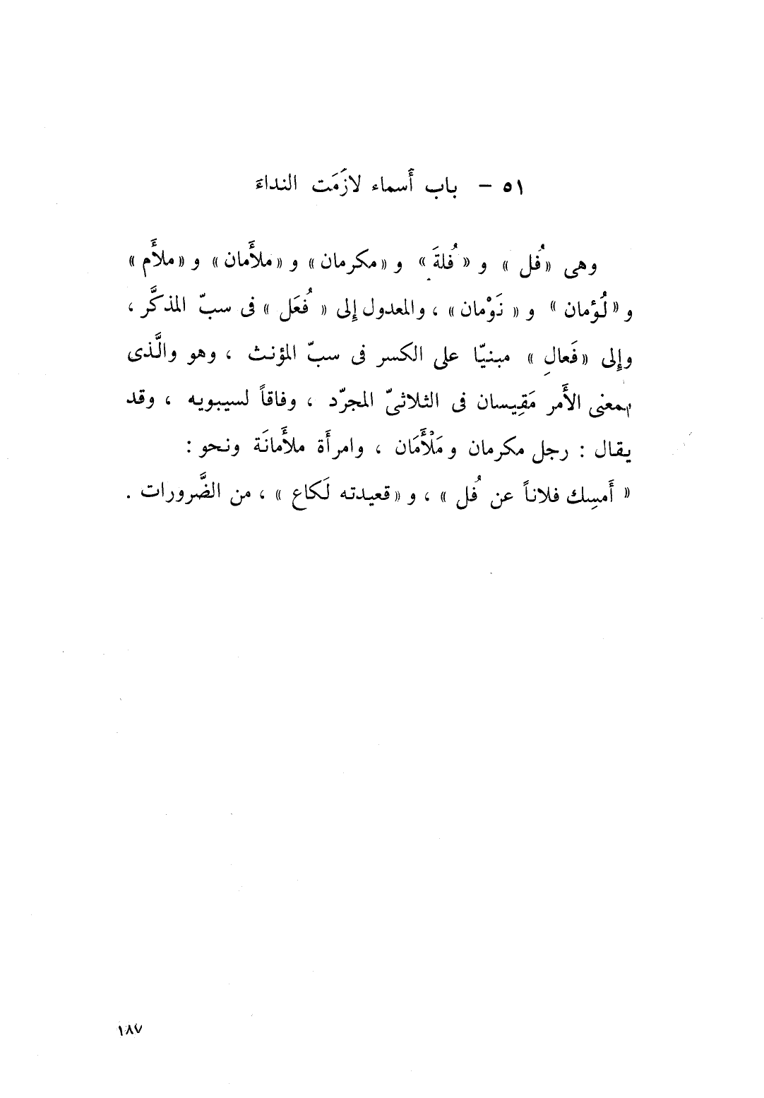 وهي " فل" و " فلة " و" مكرمان " وملأمان " " وملأم " و " لؤمان " و"نومان " والمعدول الى " فعل " في سبب المذكر والى " فعال " مبنيا على الكسر في سب المؤنث، وهو والذي بمعنى الامر مقيسان في الثلاثي المجرد وفاقا لسيبويه. وقد يقال: رجل مكرمان وملأمان، وامرأة ملأمانة ونحو: " امسك فلانا عن فل "، و " قعيدته لكاع " من الضرورات.