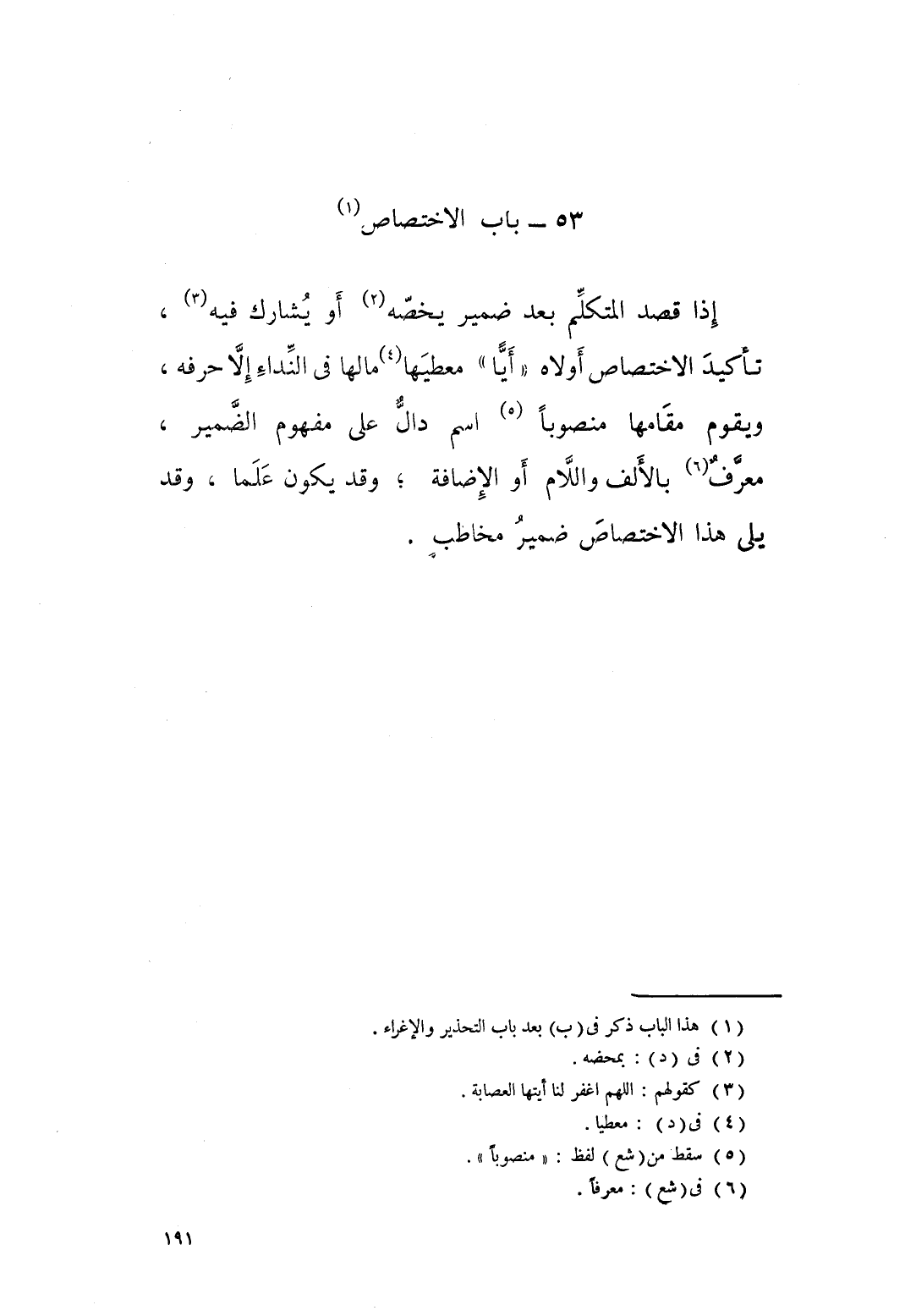 اذا قصد المتكلم بعد ضمير يخصه او يشارك فيه تأكيد الاختصاص اولاه " ايا " معطيها مالها فثي النداء الا حرفه، ويقوم مقامها منصوبا اسم دال على مفهوم الضمير، معرف بالالف واللام او الاضافة، وقد يكون علما، وقد يلي هذا الاختصاص ضمير مخاطب.