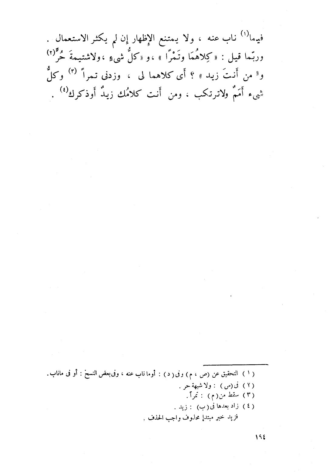 فيما اناب عنه، ولا يمتنع الاظهار ان لم يكثر الاستعمال. وربما قيل.: “ كلاهما وتمرا “ و “ كل شيء ولا شتيمة حر “، و “ من انت زيد؟ “ اي: كلاهما لي، وزدني