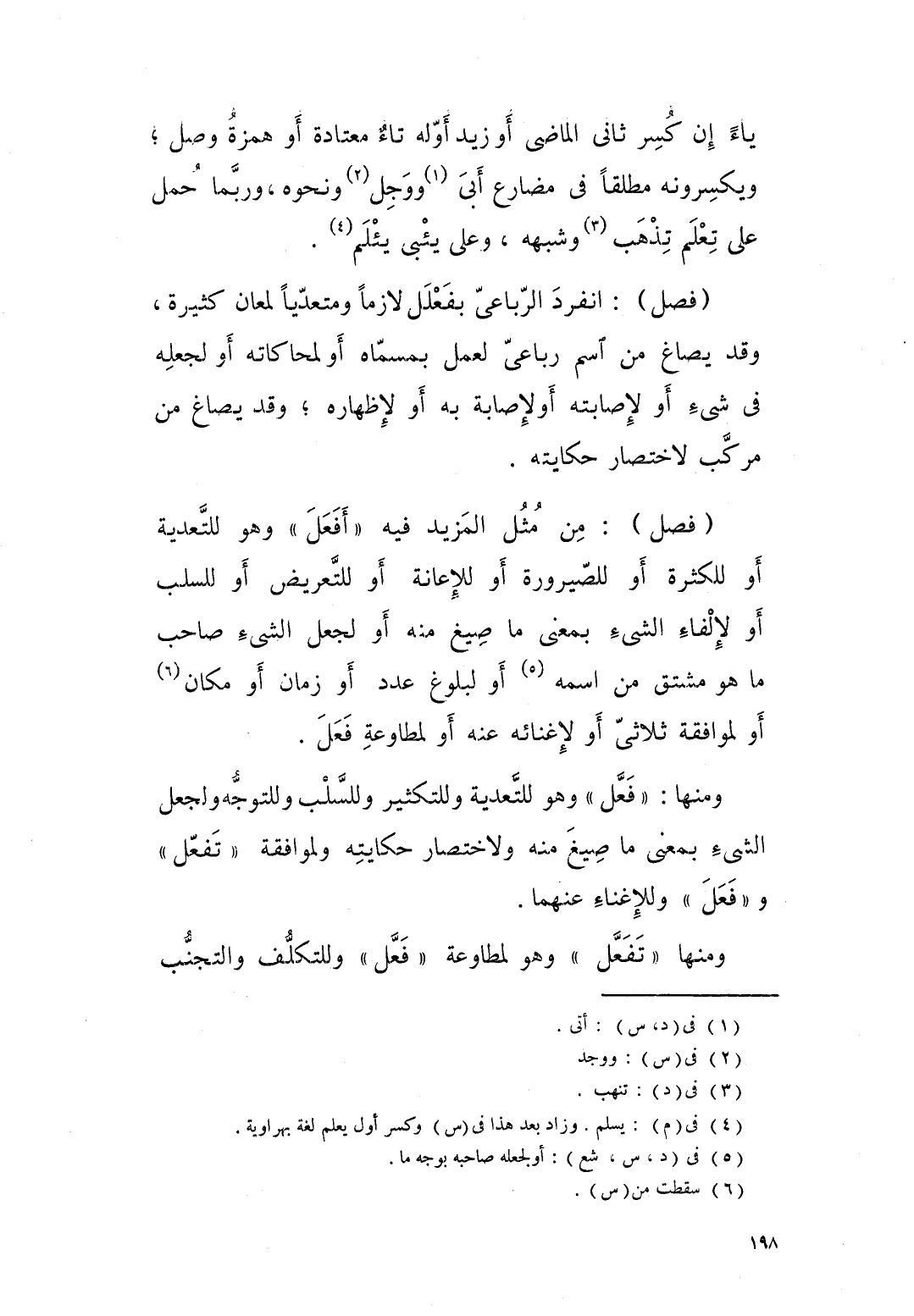 ومنها “ فعَّل “ وهو للتعدية، وللتكثير، وللسلب، وللتوجه، ولجعل الشيء بمعنى ما صِيغ منه، ولاختصار حكايته، ولموافقته “ تفعَّل “ و “ فعَل “ وللاغناء عنهما.