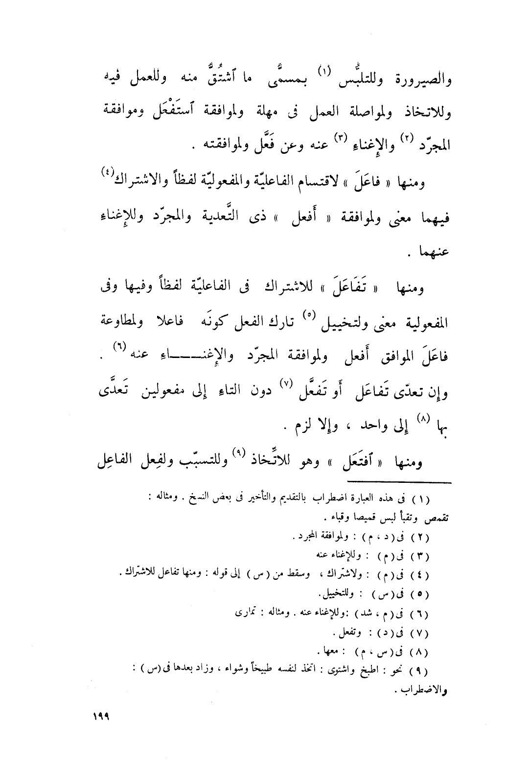 ومنها “ تفاعل “ للاشتراك في الفاعلة لفظاً وفيها وفي المفعولية معنى، ولتخييل تارك الفعل كونه فاعلا، ولمطاولة: فاعل “ الموافق “ افعل “، ولموافقة المجرد، والاغناء عنه، وان تعدى “ تفاعل “ او “ تفعل “ دون التاء الى مفعولين تعدى “ بها “ الى واحد والا لزم.