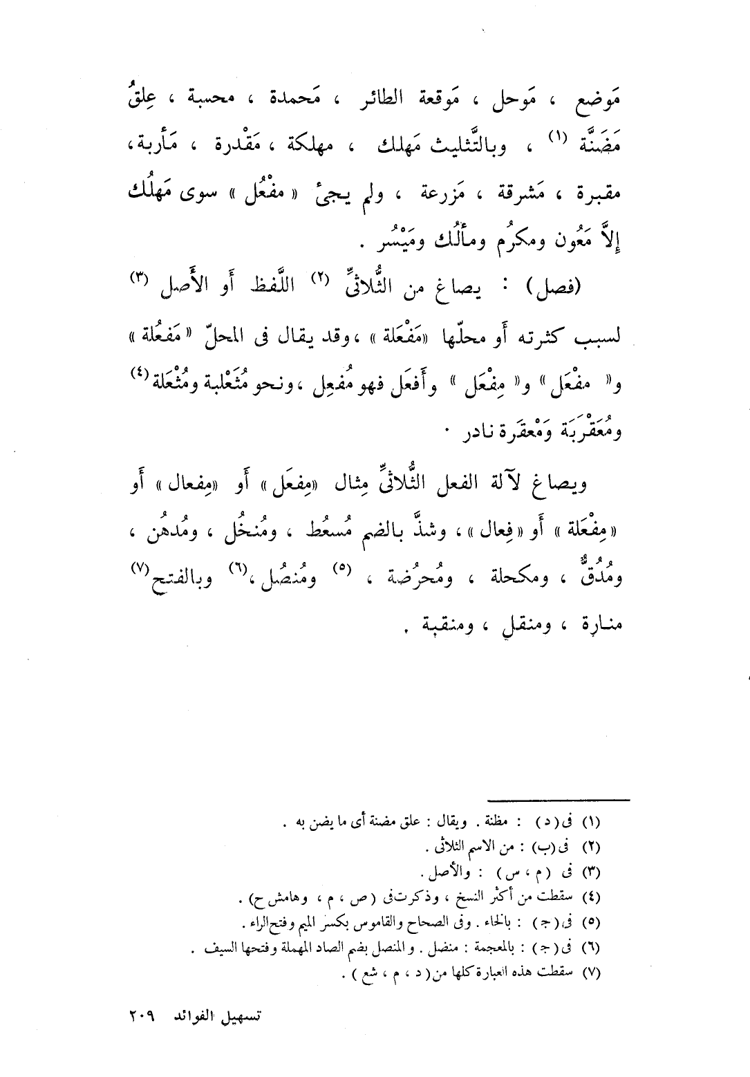 يصاغ من الثلاثي اللفظ او الاصل لسبب كثرته او محلها " مفعلة " وقد يقال في المحل: " مفعلة " و " مفعل " و " افعل فهو مفعل " ونحو: " مثعلبة [ومثعلة] ومعقربة ومعقرة " نادر، ويصاغ لالة الفعل الثلاثي مثال " مفعل " او " مفعال " او " مفعلة " او " فعال " وشذ بالضم: مسعط، ومنخل، ومدهن، ومدق، ومكحلة، ومحرضة، منصل، وبالفتح: منارة، ومنقل، ومنقبة.