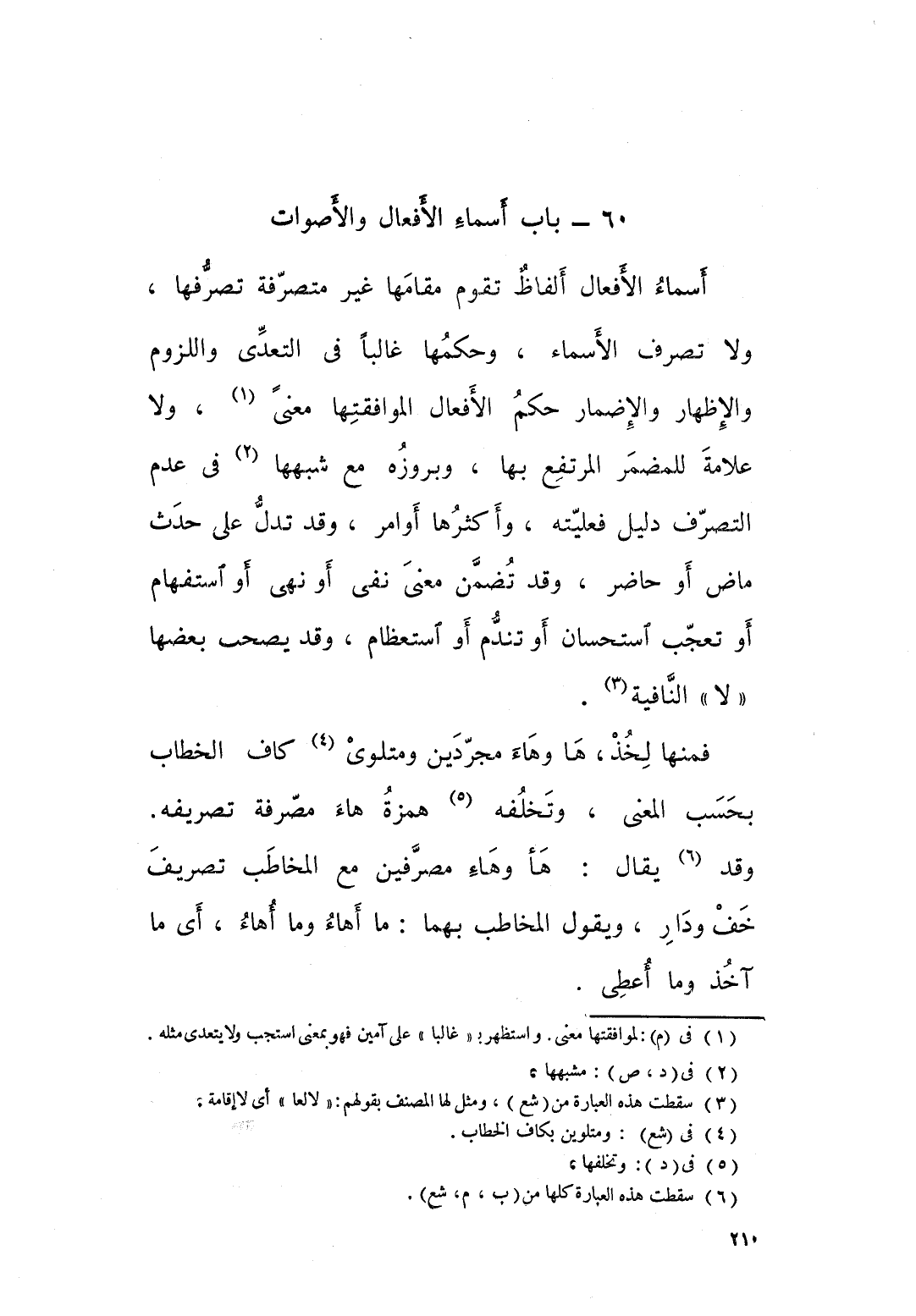 / اسماء الافعال الفاظ تقوم مقامها غير متصرفة تصرفها، ولا تصرف الاسماء، وحكمها ـ غالبا ـ في التعدي واللزوم والاظهار والاضمار حكم الافعال الموافقتها معنى، ولا علامة للمضمر المرتفع بها، وبروزه مع مشبهها في عدم التصرف دليل فعليّته.