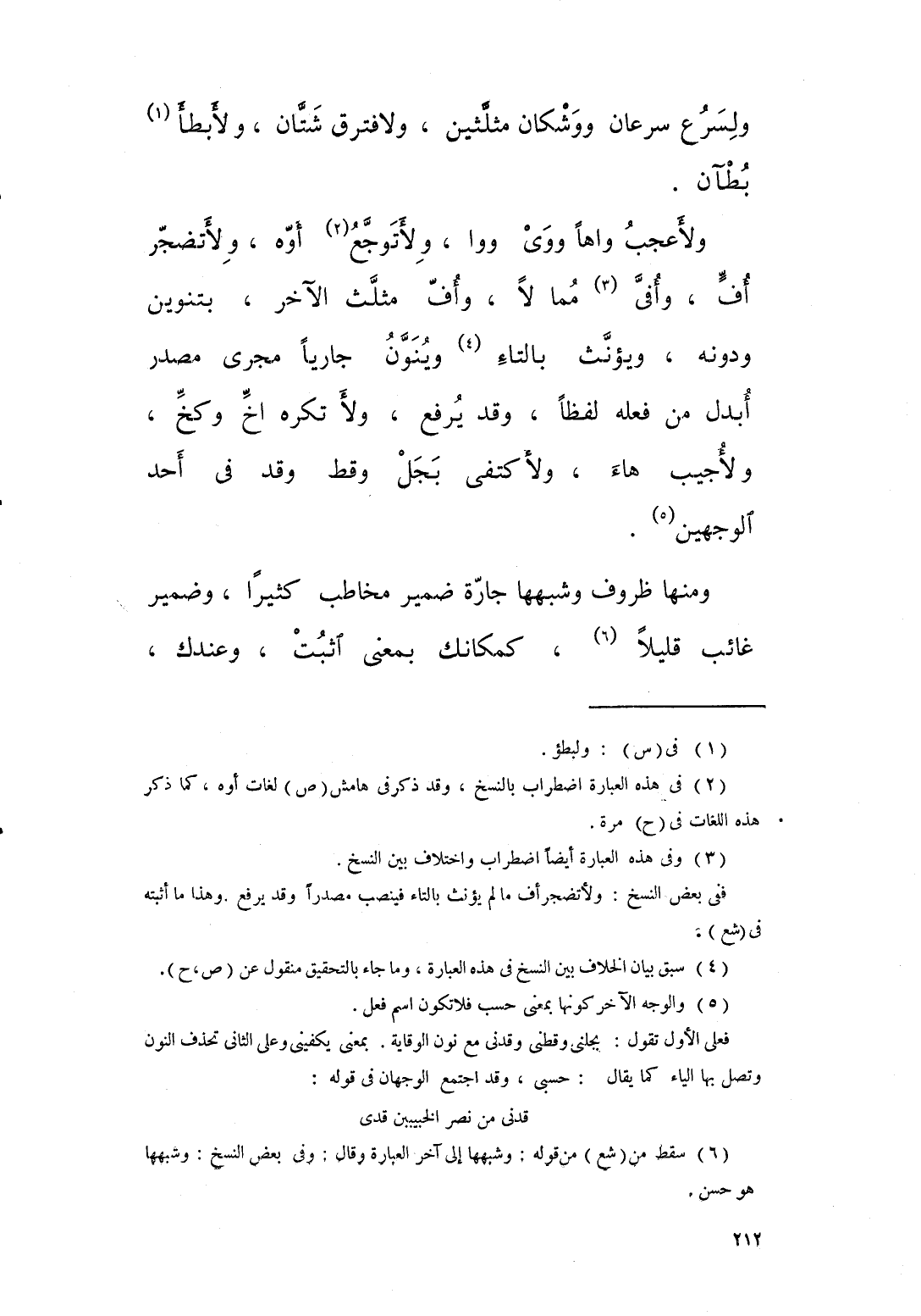 ولسرُع " سَرْعان " و " وشكان " مثلثين، ولا فترق " شتان " ولأبطأ " بطآن " ولأعجب " واهاً " و " وي " ولأتوجع " اوه "،