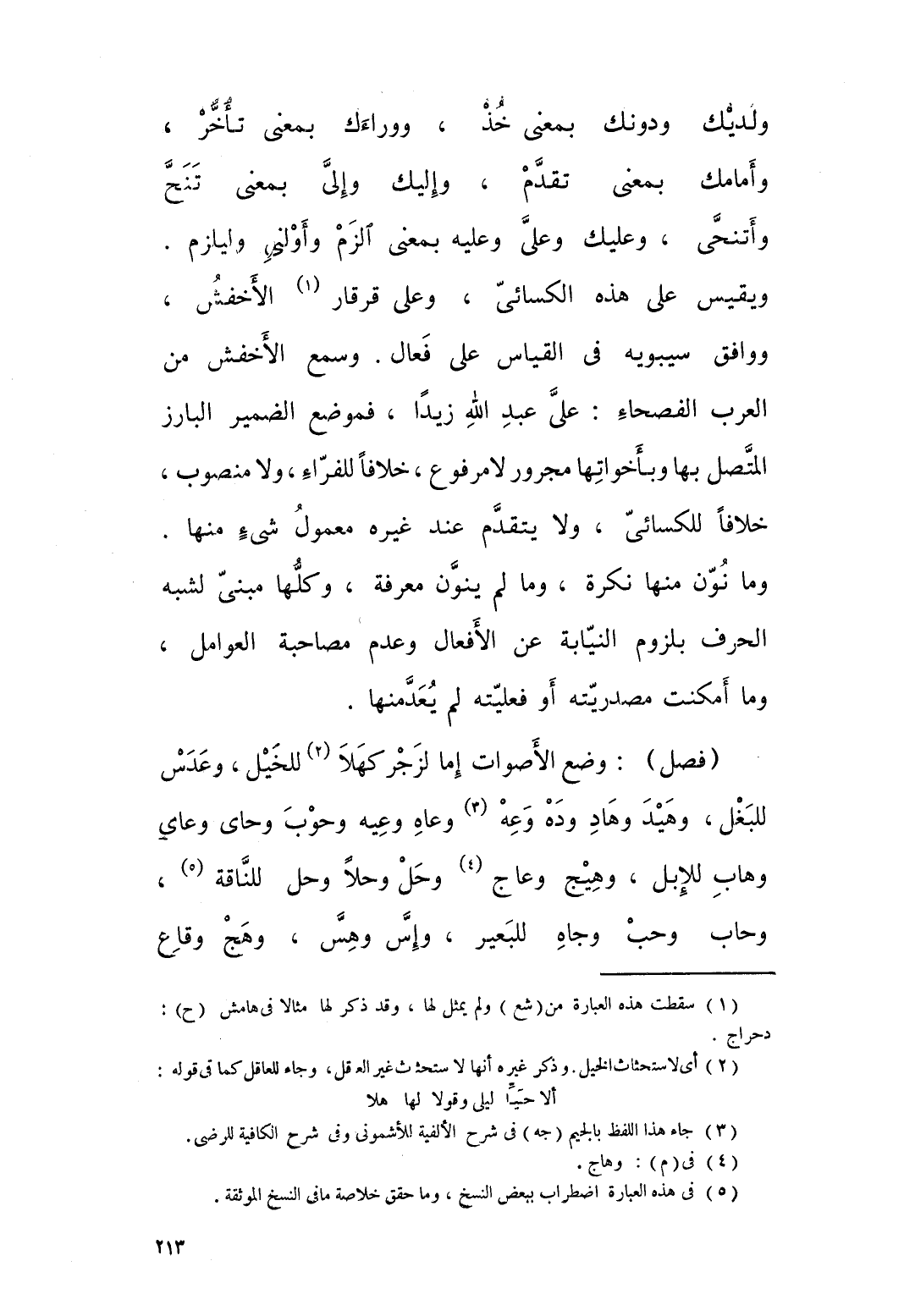 وسمع الاخفش من العرب الفصحاء: على عبد الله زيدا، فموضع الضمير البارز المتصل بها وبأخواتها مجرور لا مرفوع خلافا للفراء، ولا منصوب خلافا للكسائي. ولا يتقدم عند غيره معمول شيء منها، وما نون منها نكرة، وما لم ينون معرفة، وكلها مبني لشبه الحرف بلزوم النيابة عن الافعال، وعدم مصاحبة العوامل، وما امكنت مصدريته او فعليته لم يعد منها.
