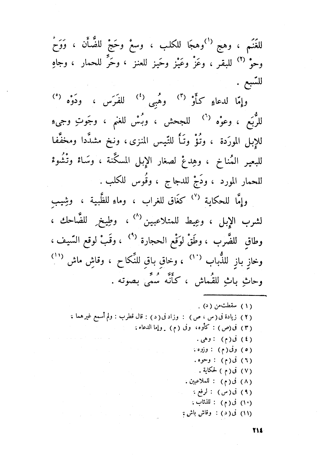 للغنم " وهج " و " هجا " للكلب و " سع" و " حج " للضأن، و "وحْ " و " حو " للبقر، و " عز " و " عيز " و " حيز للعنز "، و " حر " للحمار، و " جاه " للسبع، واما لدعاء كـ " او "وهبي للفرس، و " دوه " للربع، و " عوه " للجحش، و" بس " للغنم، و " جوت " و " جيء " للابل الموردة، و " تؤ " و " تا " للتيس المنزي، و " نخ " مشددا ومخففا، للبعير المناخ، و " هدع " لصغار الابل المسكنة، و " ساء " و "تشوء " للحمار المورد، و " دج " للدجاج، و " قوس " للكلب، واما للحكاية كـ " غاق " للغراب، و " ماء " للظبية، و "شيب " لشرب الابل، و " عيط " للمتلاعبين، و " طيخ " للضاحك، و " طاق " للضرب، و " طق " لوقع الحجارة، و " قب " لوقع السيف، و " خاز باز " للذباب، و " خاق باق " للنكاح، و " قاش ماش " و " حاث باث " للقماش كأنه سمي بصوته،