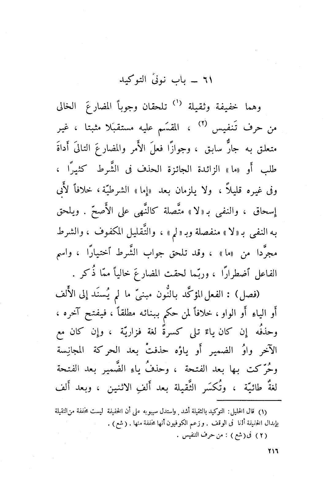 وهما خفية وثقيلة تلحقان وجوبا المضارع الخالي من حرف تنفيس، المقسم عليه مستقبلا مثبتا، غير متعلق به جار سابق، وجوازا فعل الامر والمضارع التالي اداة طلب، او " ما " الزائدة الجائزة الحذف في الشرط كثيرا وفي غيره قليلا، ولا يلزمان بعد " اما " الشرطية ـ خلافا لأبي اسحق والنفي بـ " لا " متصلة كالنهي على الاصح ويلحق به النفي بـ " لا " منفصلة، وبـ " لم "، والتقليل المكفوف بـ " ما "، والشرط مجردا من " ما " وقد تلحق جواب الشرط اختيارا واسم الفاعل اضطرارا، وربما لحقت المضارع خاليا مما ذكر.