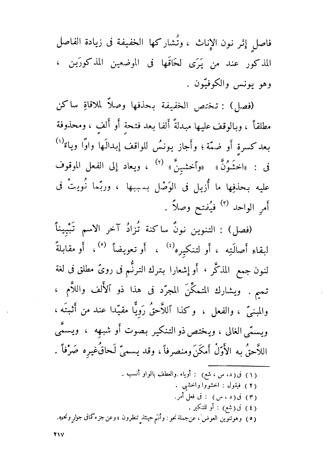 التنوين: نون ساكنة تزاد اخر الاسم تبيينا لبقاء اصالته، او لتنكيره، او تعويضا، او مقابلة لنون جمع المذكر، او اشعار في ترك الترنم في روي مطلق في لغة تميم، ويشارك المتمكن المجرد في هذا ذو الالف واللام، والمبني، والفعل، وكذا اللاحق رويا مقيدا عند من اثبته، ويسمى الغالي، ويختص ذو التنكير بصوت او شبهه، ويسمى اللاحق به الاول امكن ومنصرفا، وقد يسمى لحاق غيره صرفاً.