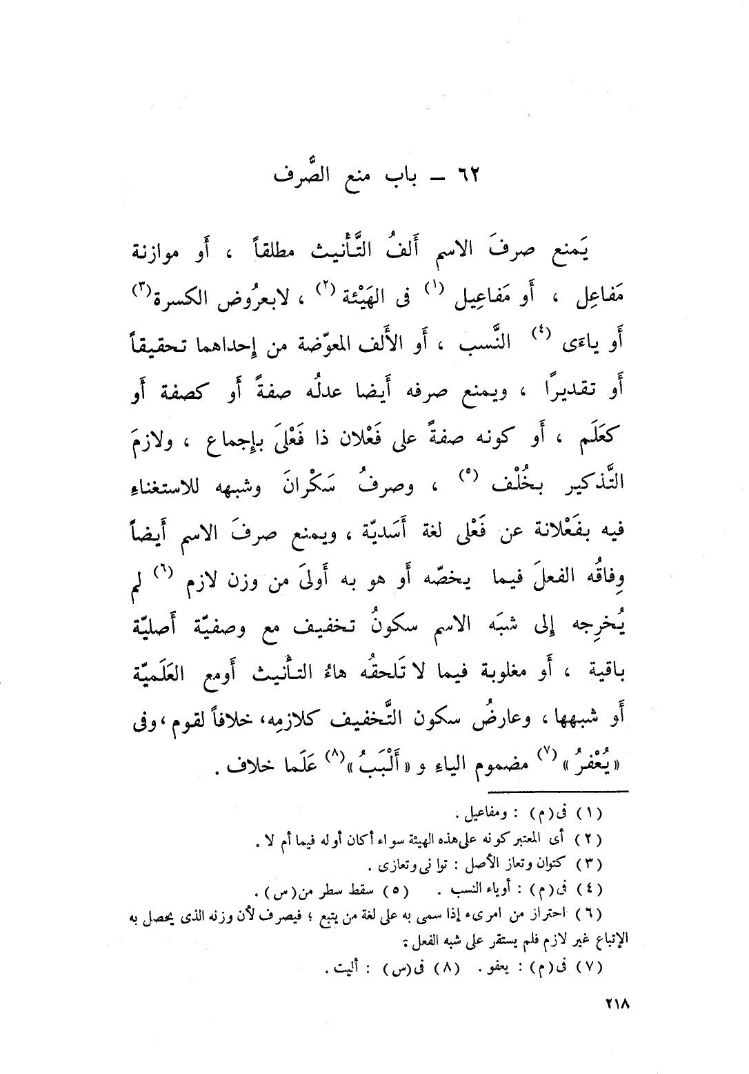 يمنع صرف الاسم الف التأنيث مطلقا او موازنة " مفاعل " او " مفاعيل " في الهيئة لا بعروض الكسرة، او ياءي النسب، او الالف المعوضة من احداهما تحقيقا او تقديرا.