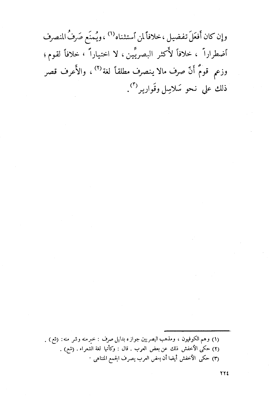 وان كان افعل تفضيل خلافا لمن استثناه ويمنع صرف المنصرف اضطرارا خلافا لأكثر البصريين، لا اختيار خلافا لقوم، وزعم قوم ان صرف ما لا ينصرف مطلقا لغة، والاعرف قصر ذلك على نحو سلاسل وقوارير.