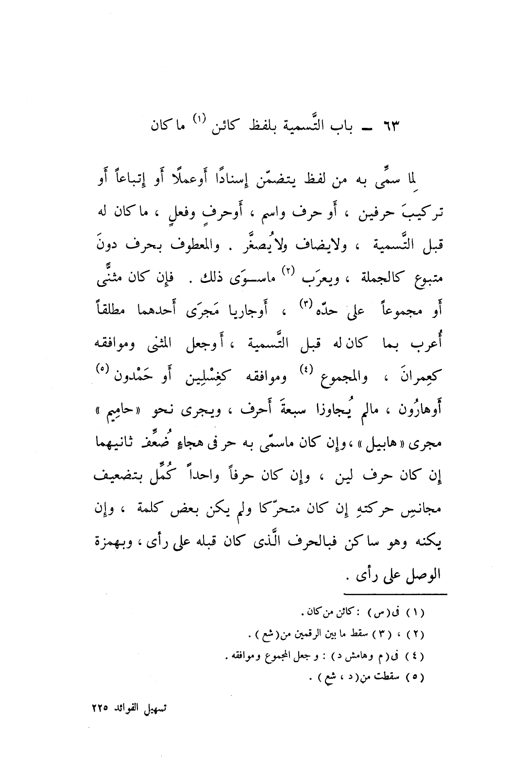 لما سمي به من لفظ يتضمن اسنادا او عملا او اتباعا او تركيب حرفين، او حرف واسم، او حرف وفعل، ما كان له قبل التسمية ولا يضاف ولا يصغر ويعرب ما سوى ذلك. فإن كان مثنى او مجموعا على حده او جاريا مجرى احدهما مطلقا اعرب بما كان له قبل التسمية او جعل المثنى وموافقه كعمران، والمجموع وموافقه كغسلين، او حمدون، او هارون ما لم يجاوزا سبعة احرف ويجري نحو حاميم مجرى هابيل. وان كان ما سمي به حرفي هجاء ضعف ثانيهما ان كان حرف لين، وان كان حرفا واحدا كمل بتضعيف مجانس حركته ان كان متحركا ولم يكن بعض كلمة، وان يكنه وهو ساكن فبالحرف الذي قبله على رأي، وبهمزة الوصل على رأي،