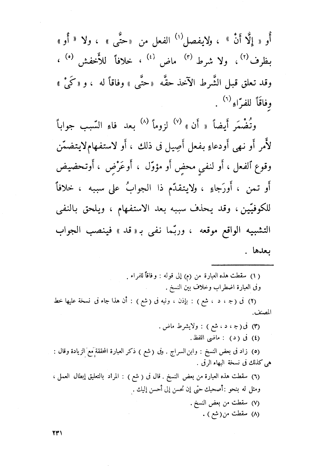 او "الا ان ". ولا يفصل الفعل من " حتى " ولا " او " بـ " اذن " ولا بشرط ماضي اللفظ خلافا للاخفش، وقد تعلق قبل الشرط الاخذ حقه " حتى " وفاقا له و " كي " وفاقا للفراء.