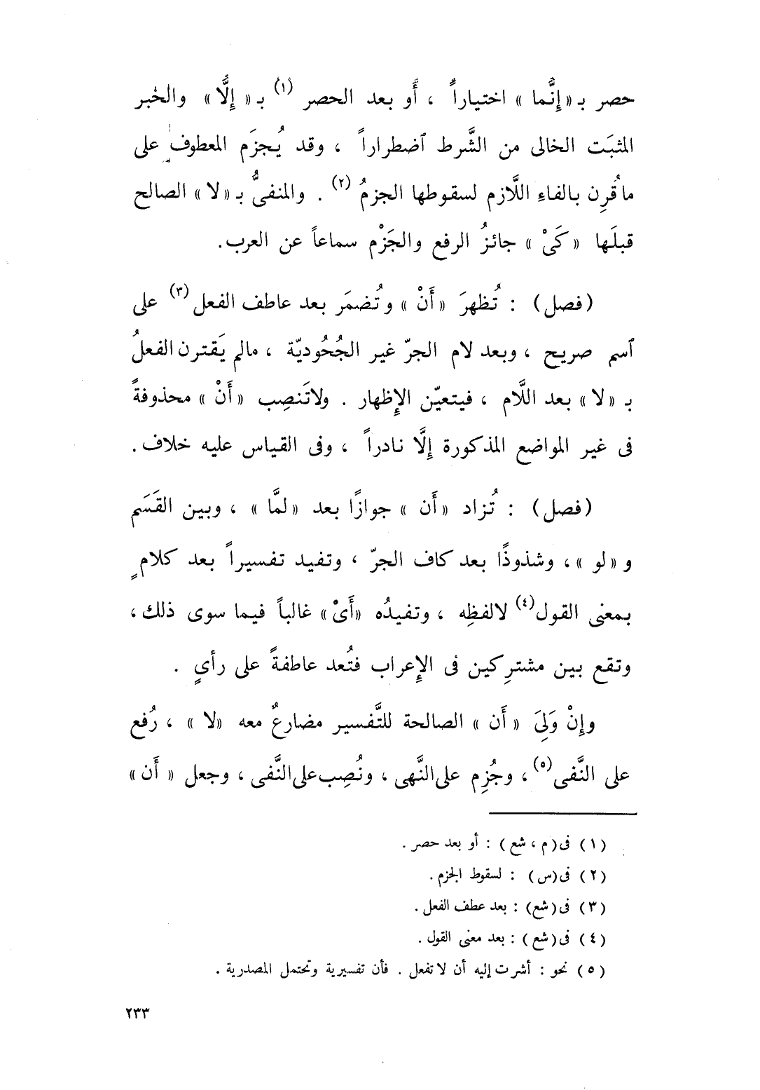 تظهر " ان " وتضمر بعد عاطف الفعل على اسم صريح، ولا بعد لام الجر غير الجحودية ما لم يقترن الفعل بـ " لا " بعد اللام فيتعين الاظهار، ولا تنصب " ان " محذوفة في غير المواضع المذكورة الا نادرا، وفي القياس عليه خلاف.