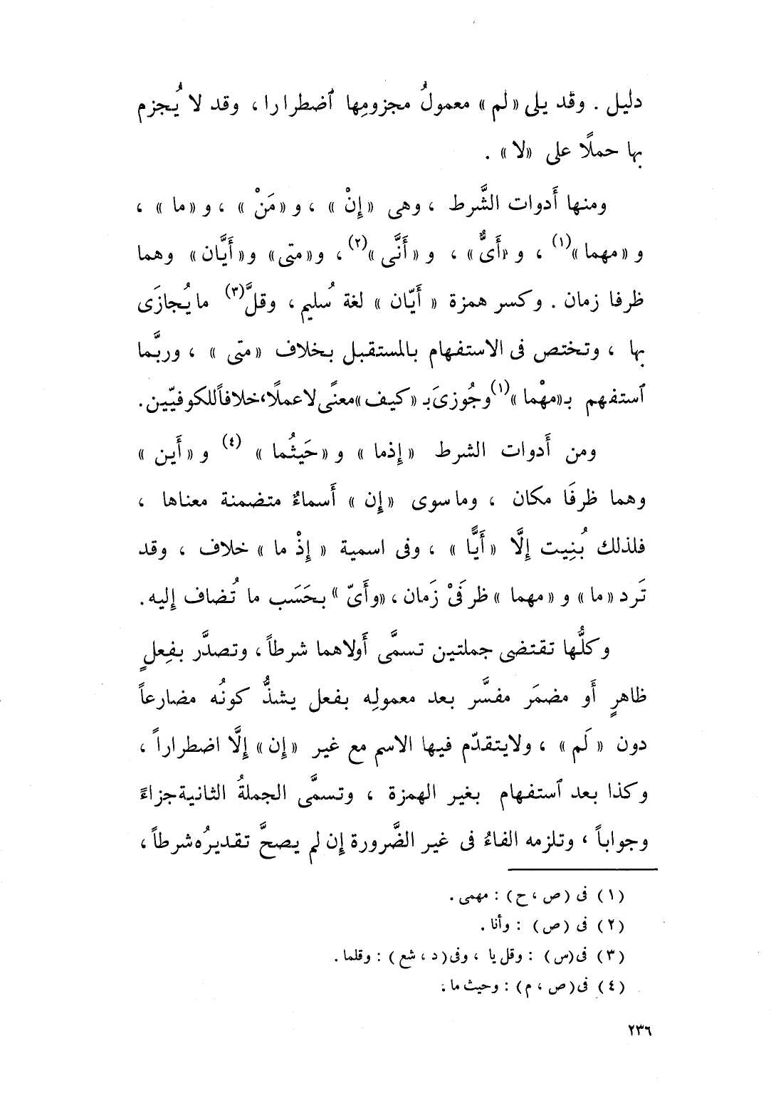 ومنها ادوات الشرط وهي: ان، ومن، وما، ومهما، واي، وانى، ومتى، وايان وهما ظرفا زمان، وكسر همزة " ايان " لغة سليم، وقل ما يجازى بها، وتختص في الاستفهام بالمستقبل بخلاف " متى "، وربما استفهم بـ " مهما " وجوزي بـ " كيف " معنى لا عملا خلافا للكوفيين، ومن ادوات الشرط: اذما، وحثيما، واين، وهما ظرفا مكان، وما سوى " ان " اسماء متضمنة معناها فلذلك بنيت الا " ايا "، وفي اسمية " اذما " خلافا، وقد ترد " ما " و " مهما " ظرفي زمان، و " اي " بحسب ما تضاف اليه. وكلها تقتضي جملتين تسمى اولاهما: شرطيا وتصدر بفعل ظاهر او مضمر مفسر بعد معموله بفعل يشذ كونه مضارع دون " لم "، ولا يتقدم في الاسم مع غير " ان " الا اضطرارا، وكذا بعد استفهام بغير الهمزة، وتسمى الجملة الثانية: جزاء وجوابا، وتلزمه الفاء في غير الضرورة ان لم يصح تقديره شرطا،