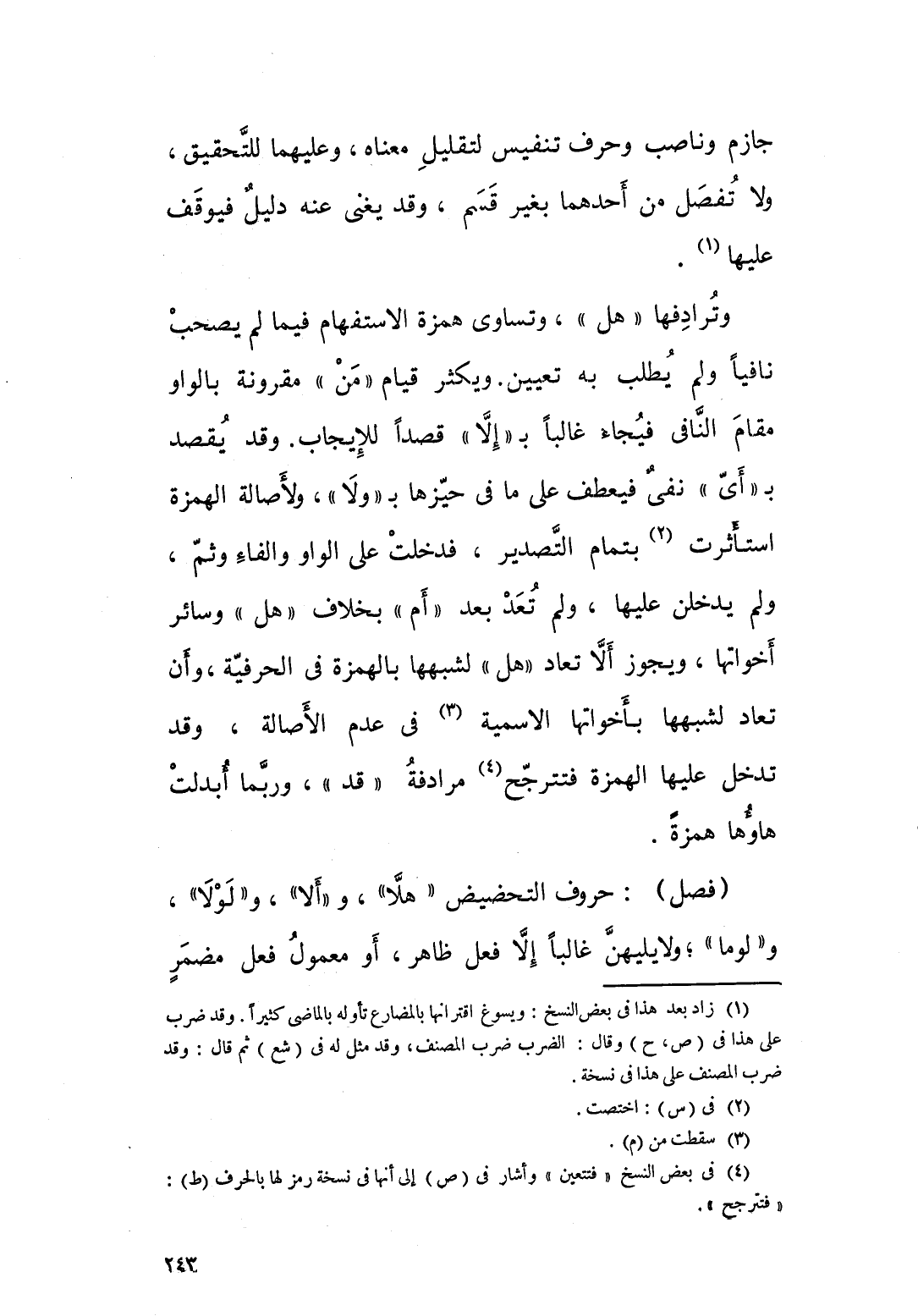 جازم وناصب وحرف تنفيس لتقليل معناه، وعليهما للتحقيق، ولا يفصل بين احدهما بغير قسم، وقد يغني عنه دليل فيوقف عليها، ويسوغ اقترانها بالمضارع تأوله بالماضي كثيرا، وترادفها هل. وتساوي همزة الاستفهام فيما لم يصحب نافيا، ولم يطلب به تعيين ويكثر قيام “ من “ مقرونة بالواو مقام النافي، فيجاء غالبا ب” الا “ قصدا للايجاب، وقد يقصد بـ “ اي” نفي فيعطف على ما في حيزها بـ “ ولا “ ولأصالة الهمزة لاستأثرت بتمام التصدير فدخلت على “ الواو “ و “ ثم “ ولم يدخلن عليها، ولم تعد بعد، “ ام “ بخلاف “ هل “ وسائر اخواتها، ويجوز ان لا تعاد “ هل “ لشبهها بالهمزة في الحرفية، وان تعاد لشبهها بأخواتها الاسمية في عدم الاصالة، وقد تدخل عليها الهمزة فتتعين مرادفة “ قد “ وربما ابدلت “ هاؤها “ همزة.