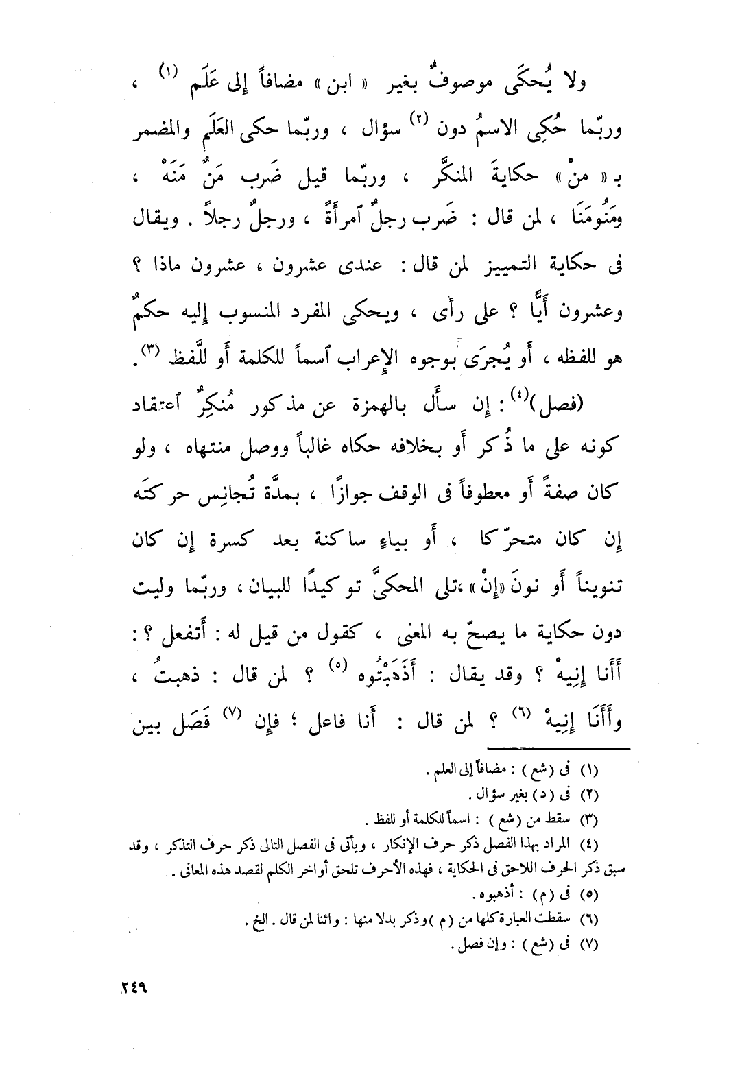 ولا يحكى موصوف بغير “ ابن “ مضاف الى علم، وربما حكي الاسم دون سؤال، وربما حكي العلم والمضمر بـ “ من “ حكاية المنكر، وربما قيل: ضرب من منه ومنو منا، لمن قال: ضرب رجل امرأ’ رجل رجلا. ويقال في حكاية التمييز لمن قال: عندي عشرون عشرون ماذا؟ وعشرون ايا؟ على رأي.