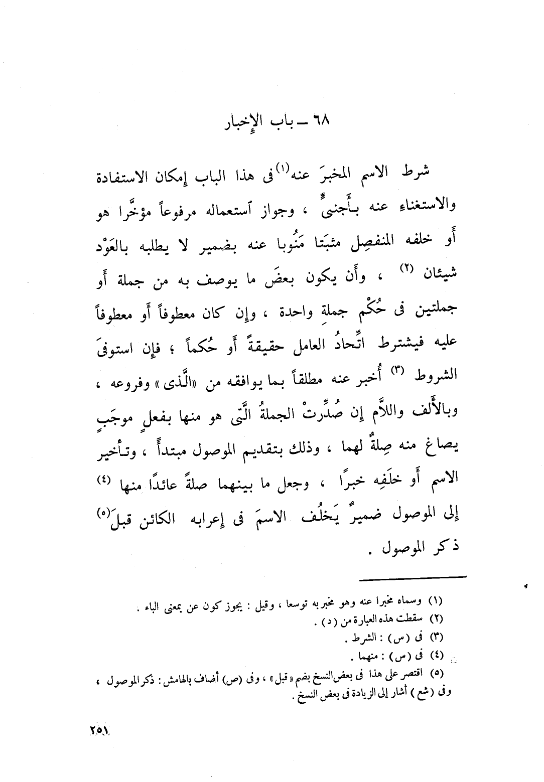/ شرط الاسم المخبر عنه في هذا الباب امكان الاستفادة والاستغناء عنه بأجنبي، وجواز استعماله مرفوعا مؤخرا هو او خلفه المنفصل مثبتا منوبا عنه بضمير وان يكون بعض ما يوصف به من جملة او جملتين في حكم واحدة، وان كان معطوفا او معطوفا عليه فيشترط اتحاد العامل حقيقة او حكما. فأن استوفى الشروط اخبر عنه مطلقا بما يوافقه من الذي وفروعه، وبالالف واللام، ان صدرت الجملة التي هو منها بفعل موجب يصاغ منه صلة لهما. وذلك بتقديم الموصول مبتدأ، وتأخير الاسم او خلفه خبرا، وجعل ما بينهما صلة عائدا منها الى الموصول ضمير يخلف الاسم في اعرابه الكائن قبل،
